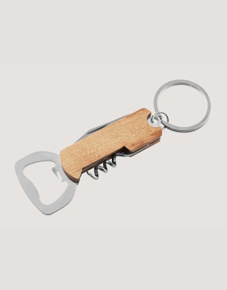 Chaveiro 3 em 1 em Bambu com Abridor de Garrafas, Saca-Rolhas e Canivete