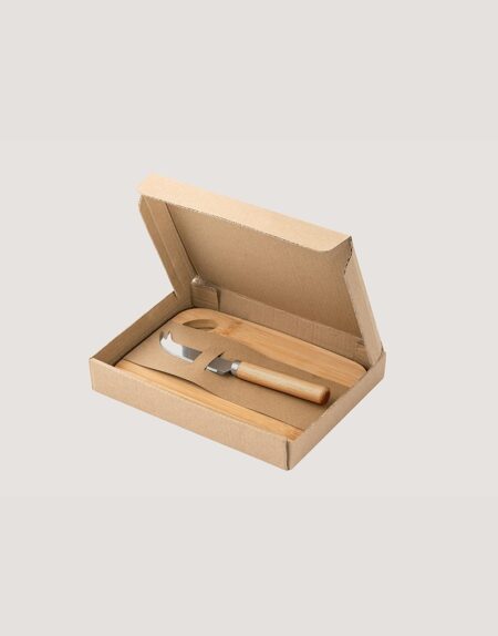 Kit Churrasco em Caixa Kraft com Tábua em Bambu e 2 Utensílios em Aço Inox e Bambu