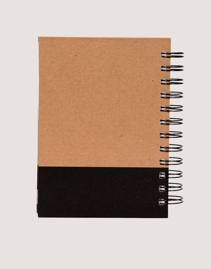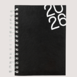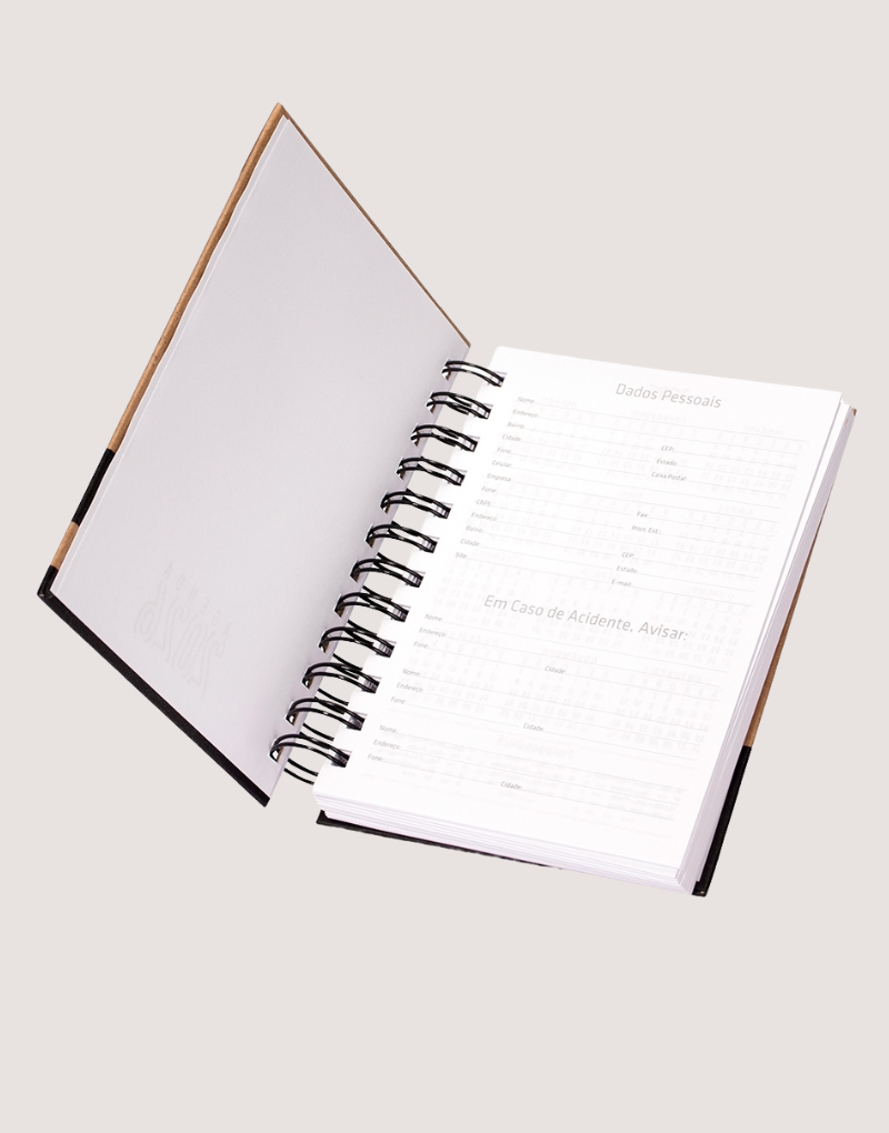 Agenda diária 2026 com capa dura em kraft, folhas brancas e encadernação Wire-O. Possui páginas dedicadas a dados pessoais, calendários de 2025 até 2027, orçamento pessoal, planejamento mensal, anotações diárias lista de contatos e aniversários do mês.