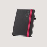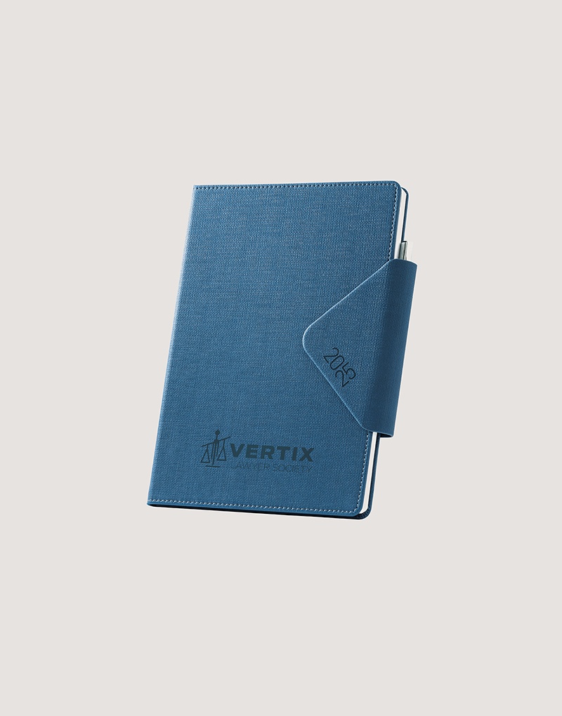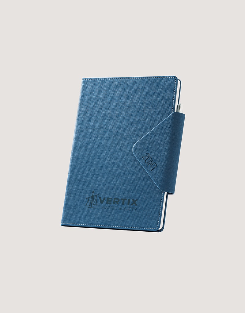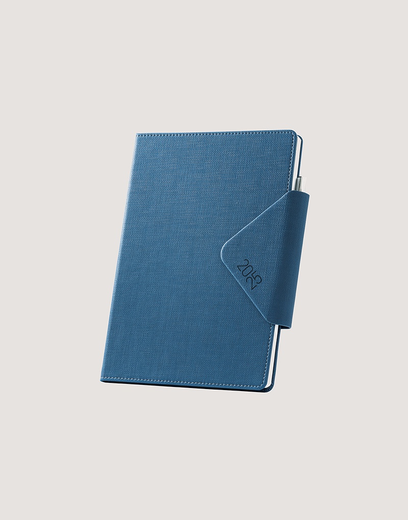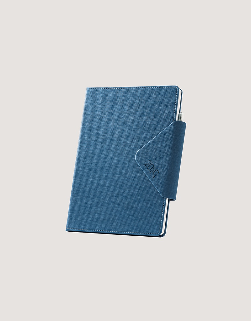 Agenda B5 em PU com fecho magnético. Está organizada num plano semanal. Com suporte para esferográfica (inclusa) e marcador em fita. Fornecida com bolsa de non-woven.