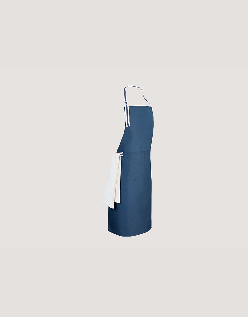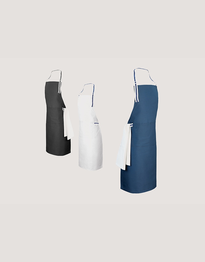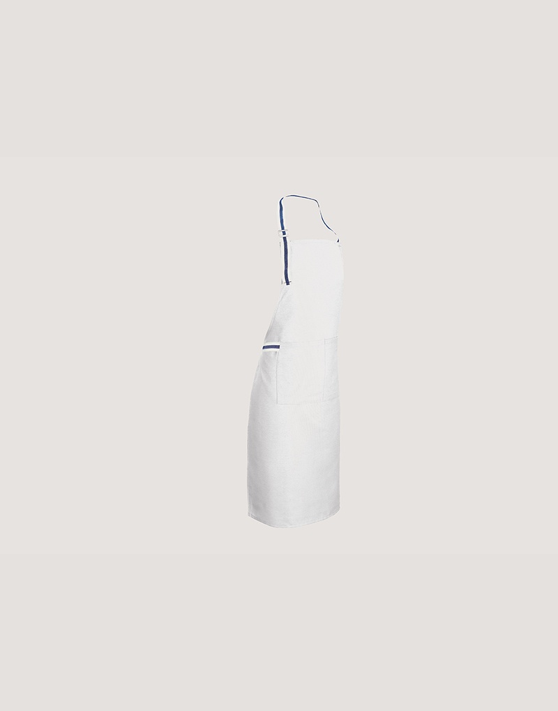 Avental em algodão e poliéster (150 g/m²) com 2 bolsos frontais. Ajustável com fivela.