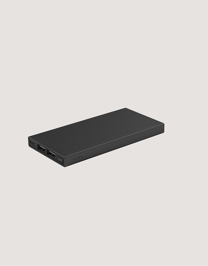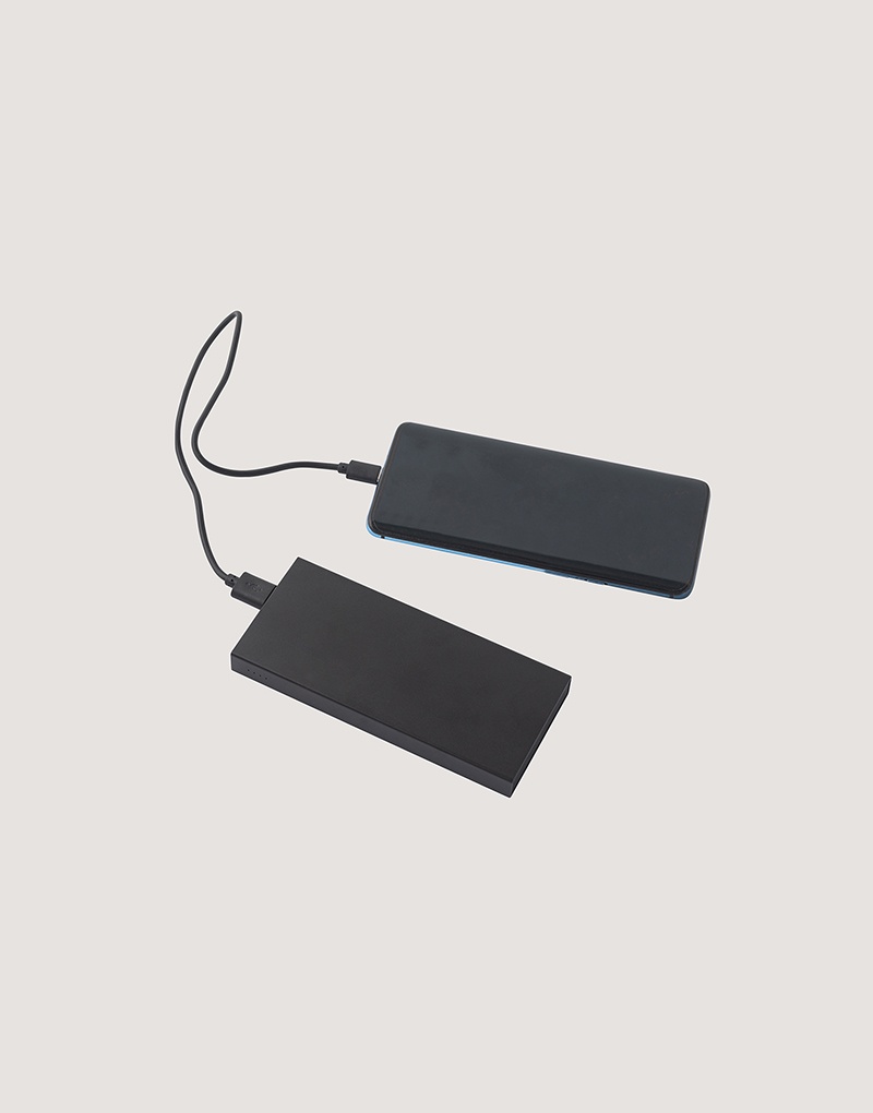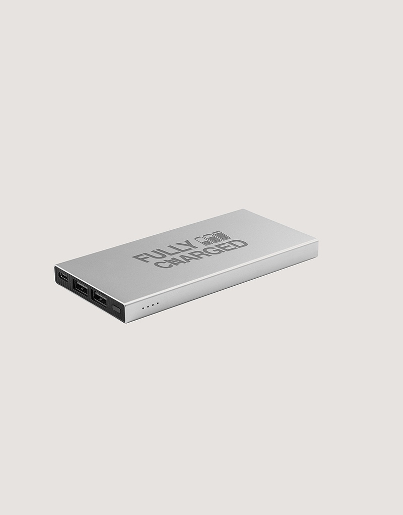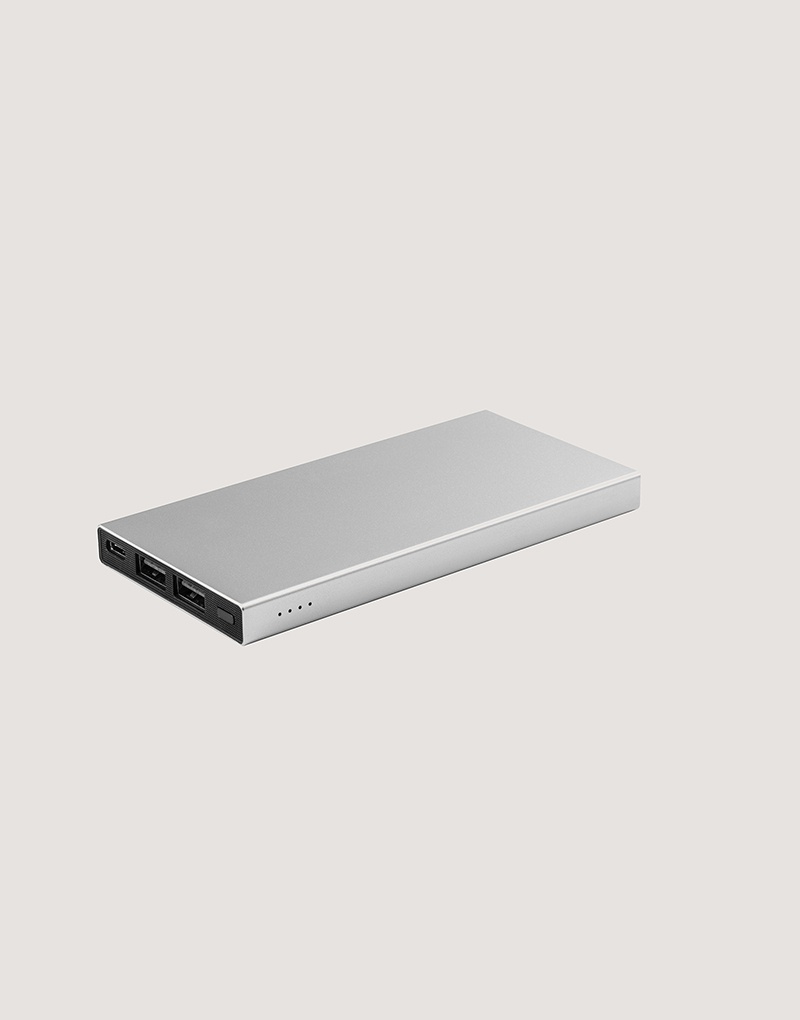 Bateria portátil em alumínio 100% reciclado. A bateria em lítio tem capacidade de 5.000 mAh e tempo de vida ≥ 500 ciclos. Possui uma entrada/saída USB-C e duas saídas USB-A. Incluso cabo de carregamento rápido USB-C. Fornecida em caixa presente de papel kraft reciclado.