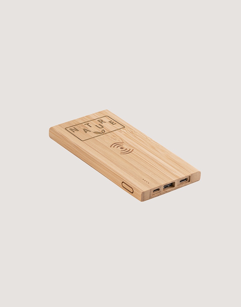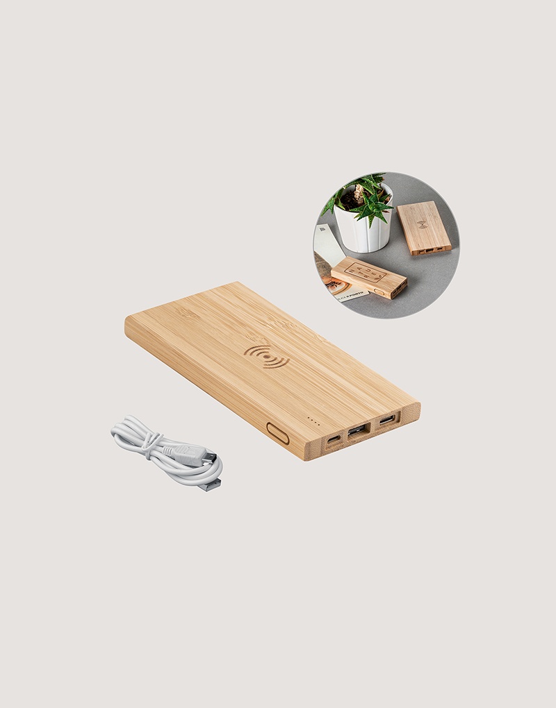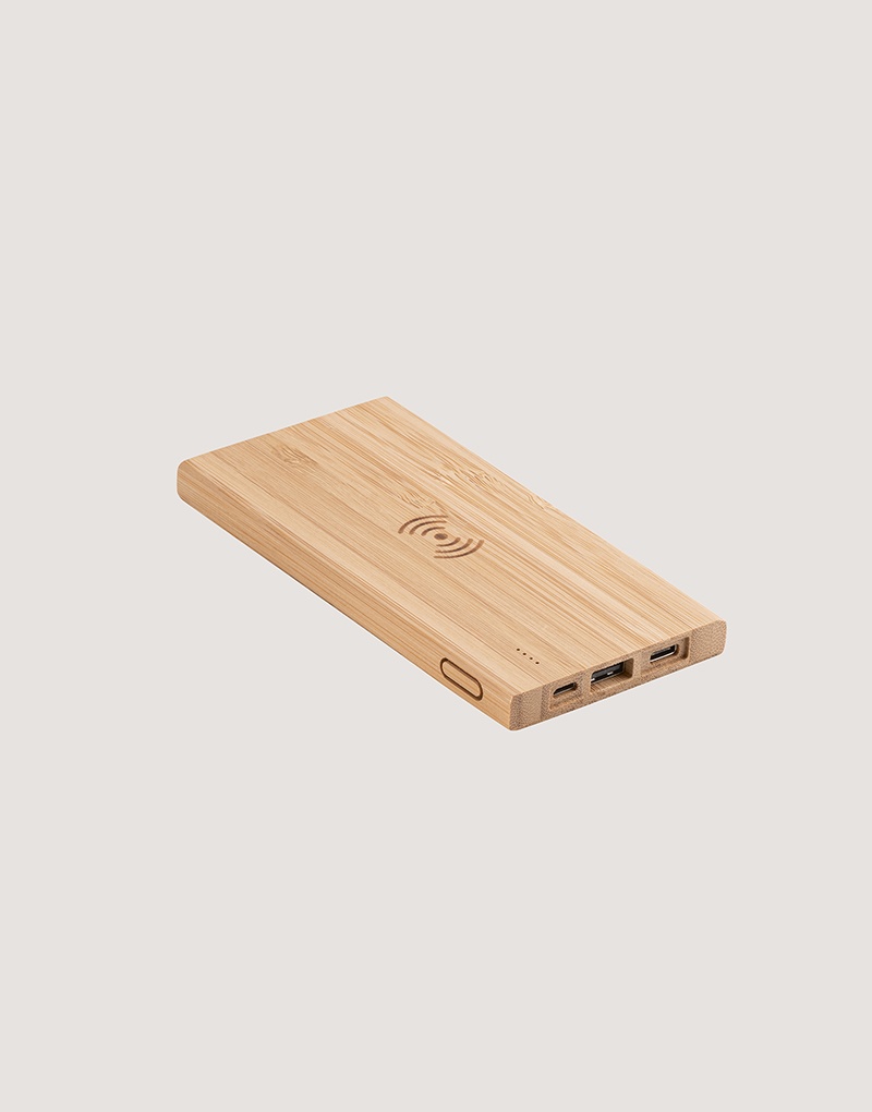 Bateria portátil com carregador wireless super rápido em bambu. Bateria de lítio com capacidade de 5.000mAh e tempo de vida ≥ 500 ciclos. Contém indicador de carga, uma porta micro USB de entrada, uma porta USB-C de entrada e saída e uma porta USB-A de saída. Potência de saída wireless, no máximo, de 15W. Incluso cabo USB para carregar. Compatível com smartphones com tecnologia de carregamento sem fios. Fornecido em caixa presente de papel kraft. A cor e o resultado da impressão nos materiais naturais pode variar entre produtos.