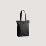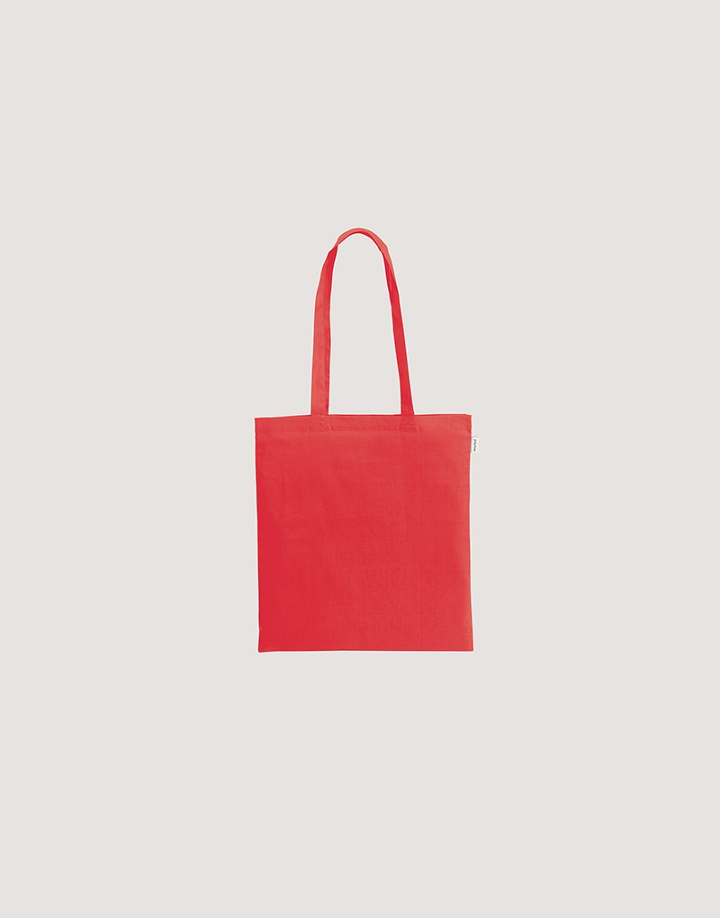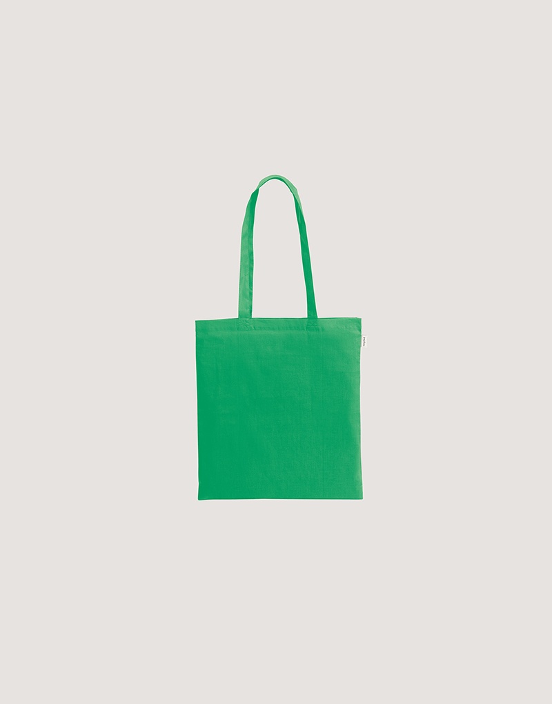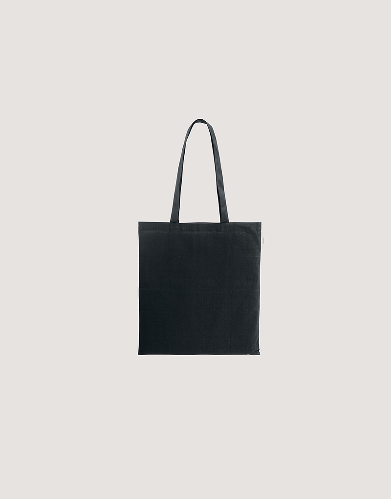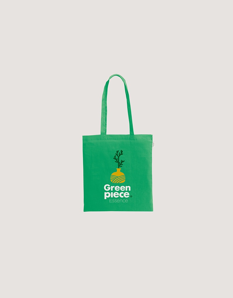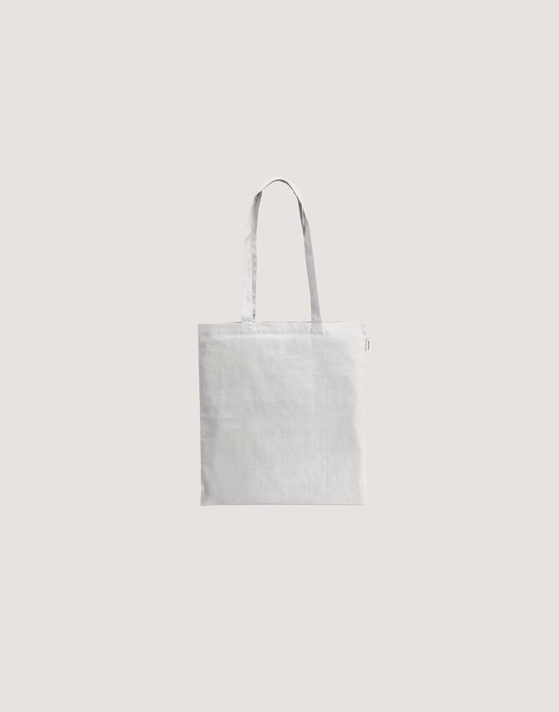 Sacola em 70% algodão reciclado e 30% poliéster reciclado (180 g/m²), com alças de 65 cm. O tecido é sem tingimento, é utilizado na sua cor original, sem produtos químicos de tingimento ou branqueamento, contribuindo para um menor impacto ambiental.