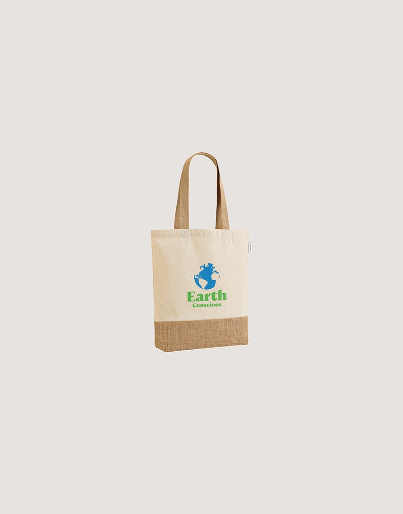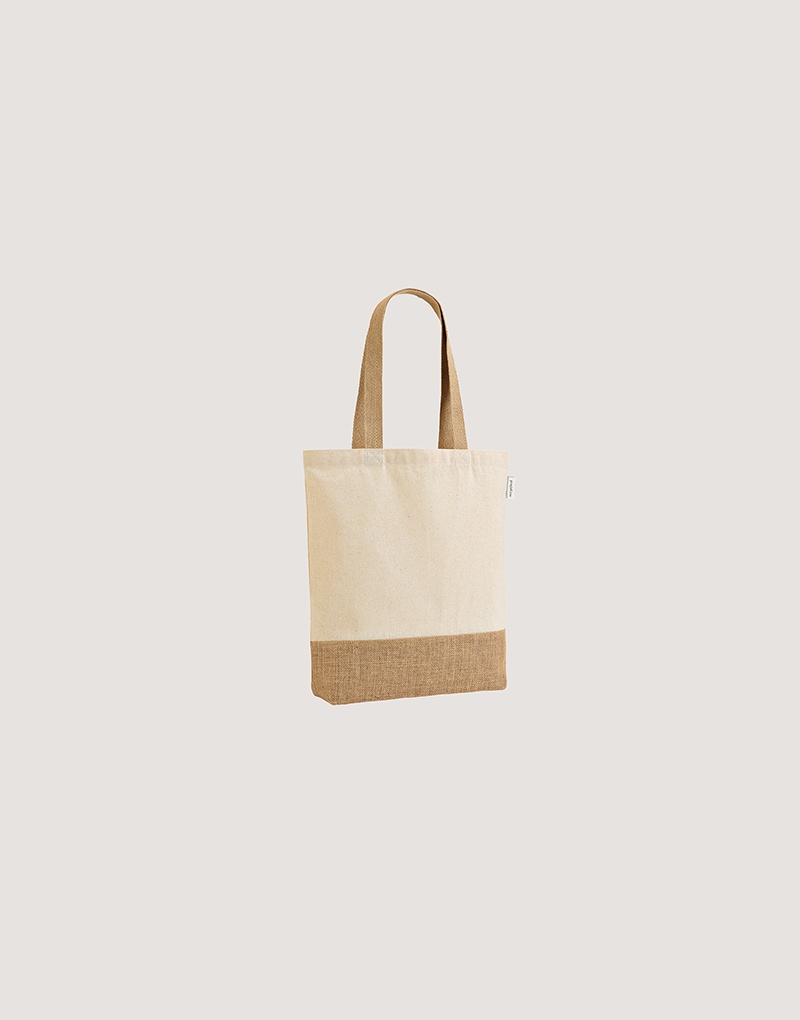 Sacola em 70% algodão reciclado e 30% poliéster reciclado (180 g/m²) com base em juta. Alças em webbing com 65 cm.