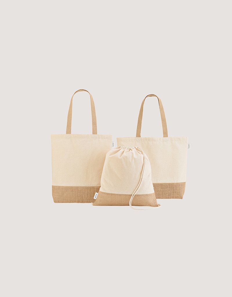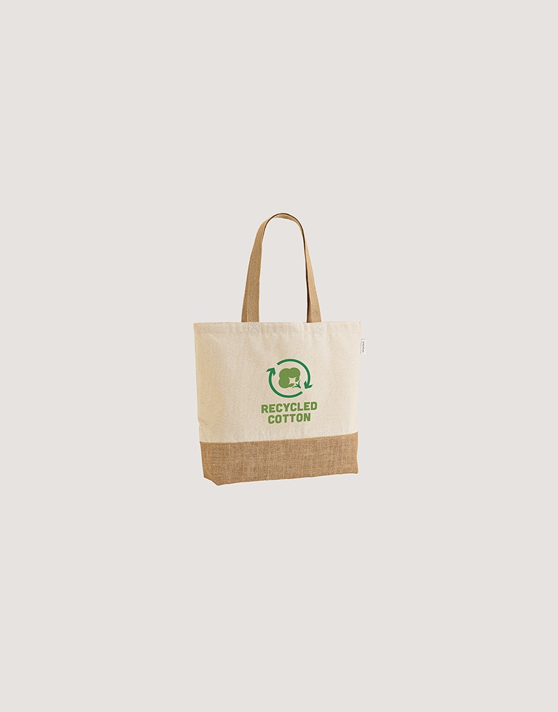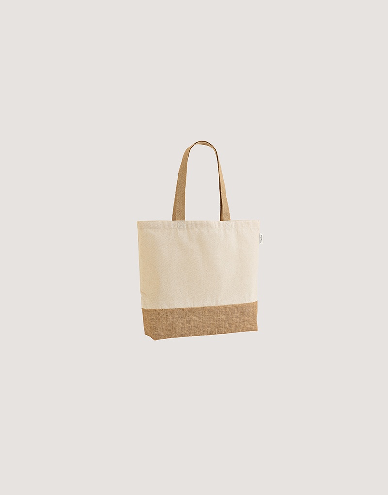 Sacola em 70% algodão reciclado e 30% poliéster reciclado (220 g/m²) com base em juta. Alças em webbing com 65 cm.
