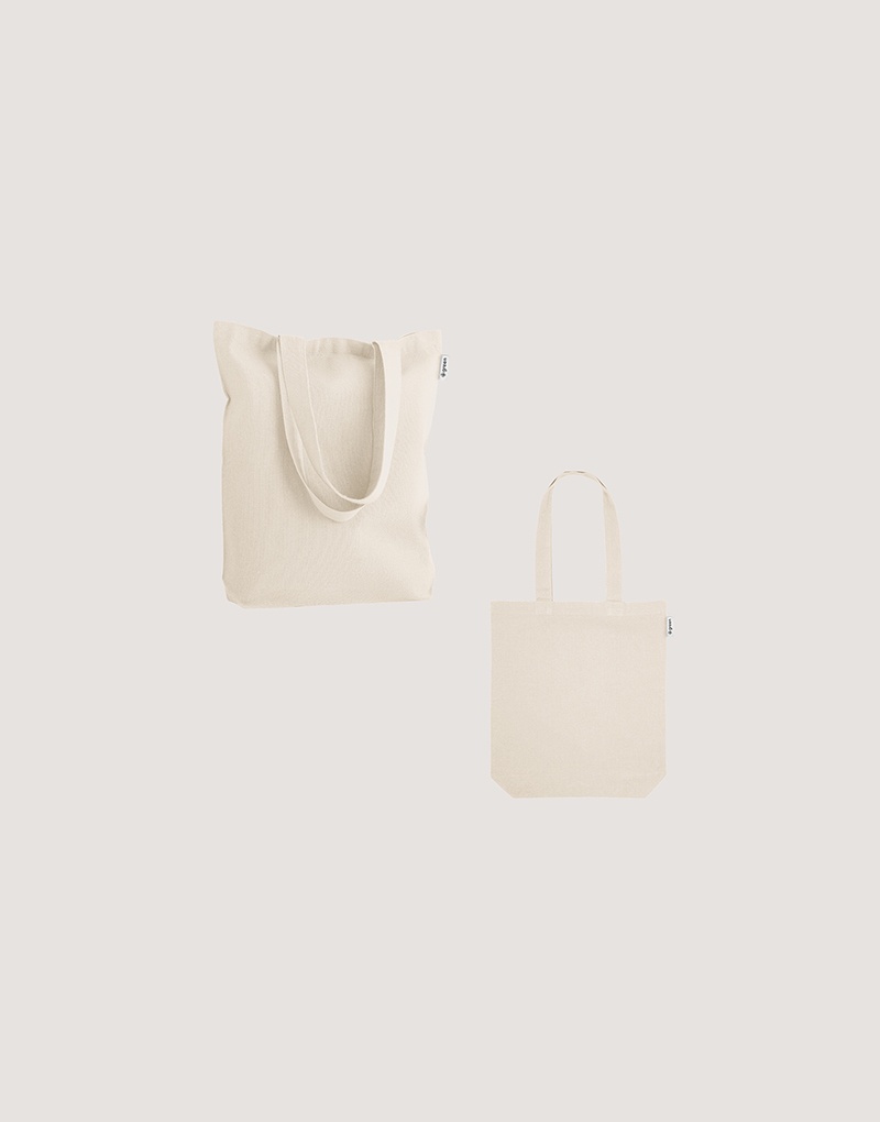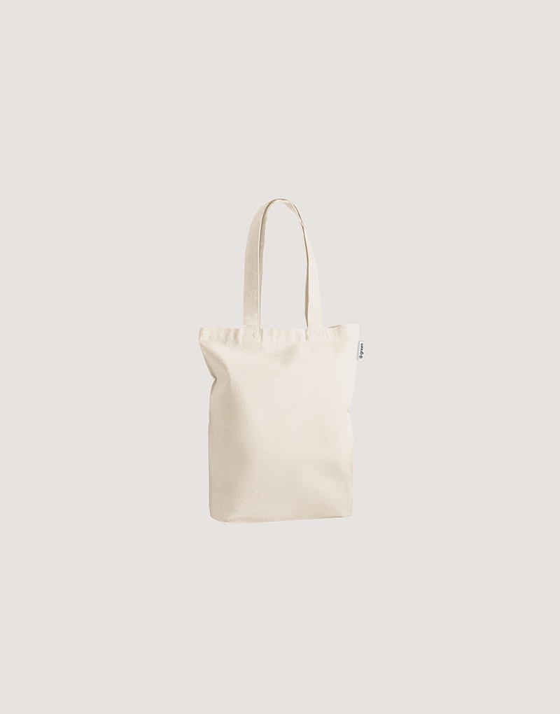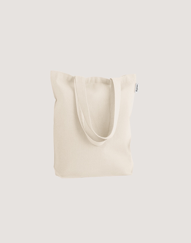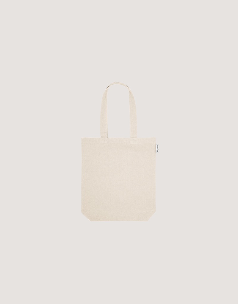 Sacola em 50% algodão, alças de 62 cm, 30% algodão reciclado e 20% poliéster reciclado (220 g/m²)
