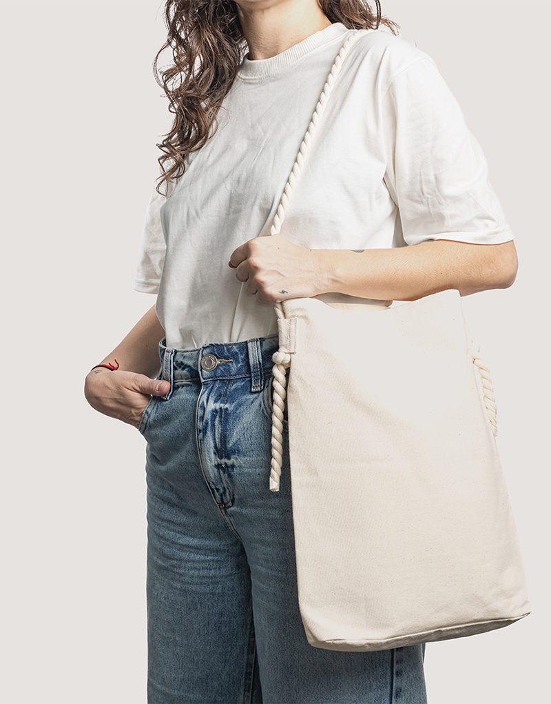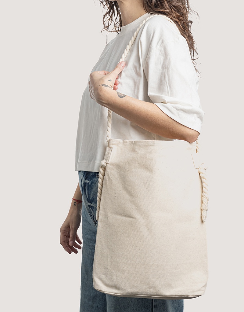 A alça em corda trançada é o charme dessa ecobag saco, que mistura funcionalidade com um mood fresh. Ideal para kits de verão, eventos ao ar livre ou campanhas com estética natural.