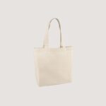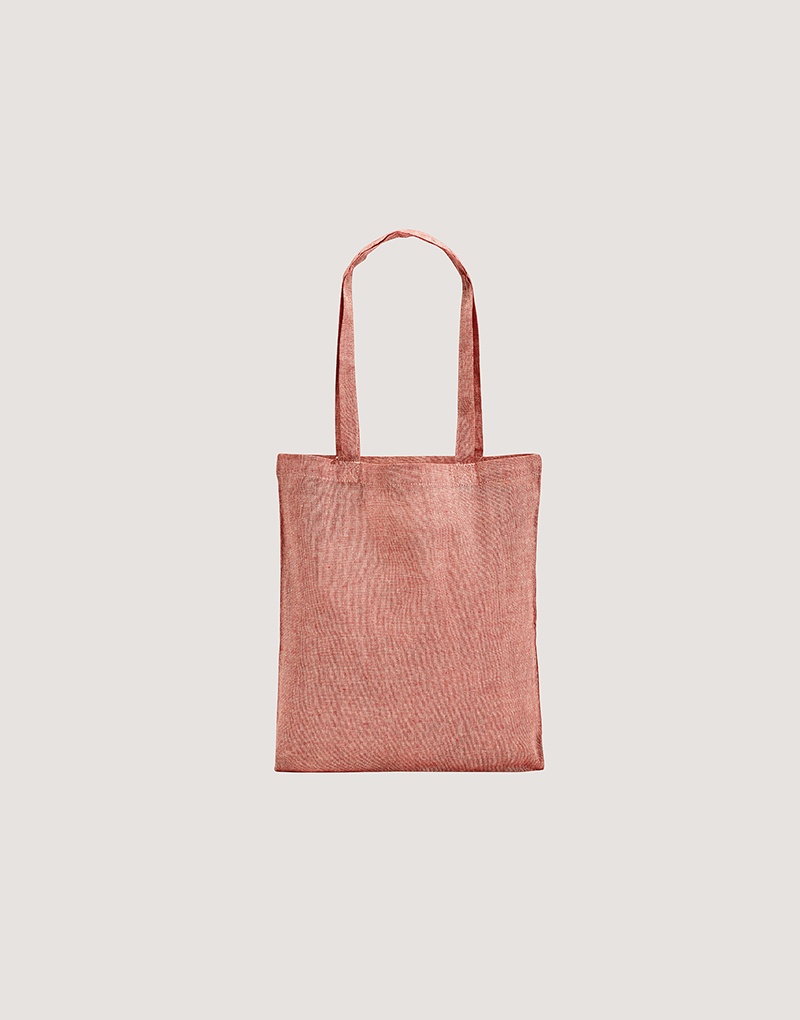 Sacola dobrável em 70% algodão reciclado e 30% poliéster reciclado (140 g/m²) com alças de 65 cm. O tecido é sem tingimento, é utilizado na sua cor original, sem produtos químicos de tingimento ou branqueamento, contribuindo para um menor impacto ambiental.
