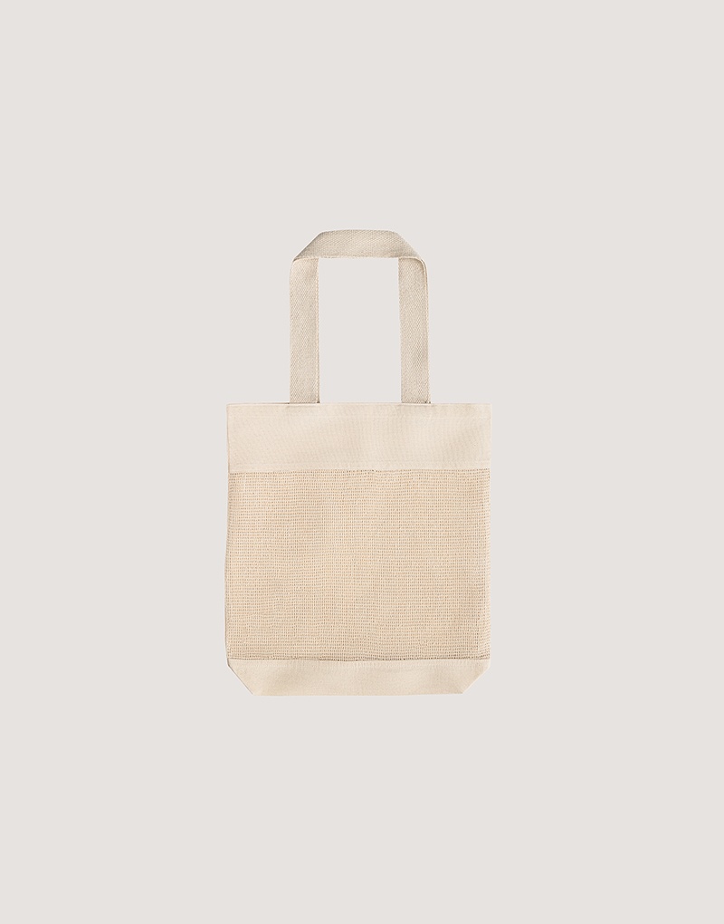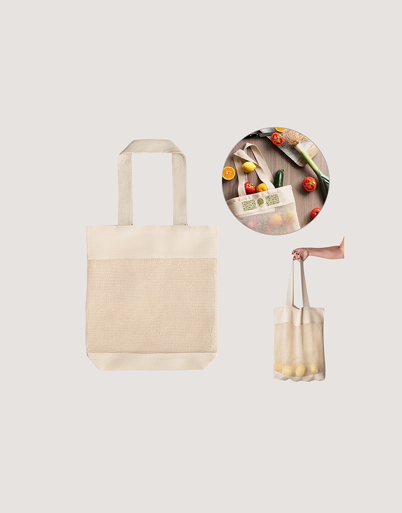 Sacola 100% algodão (180 g/m²) , alças em webbing com 65 cm, com malha 100% algodão (100 g/m²) na parte frontal. Sacola ideal para compras.