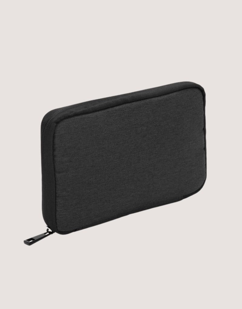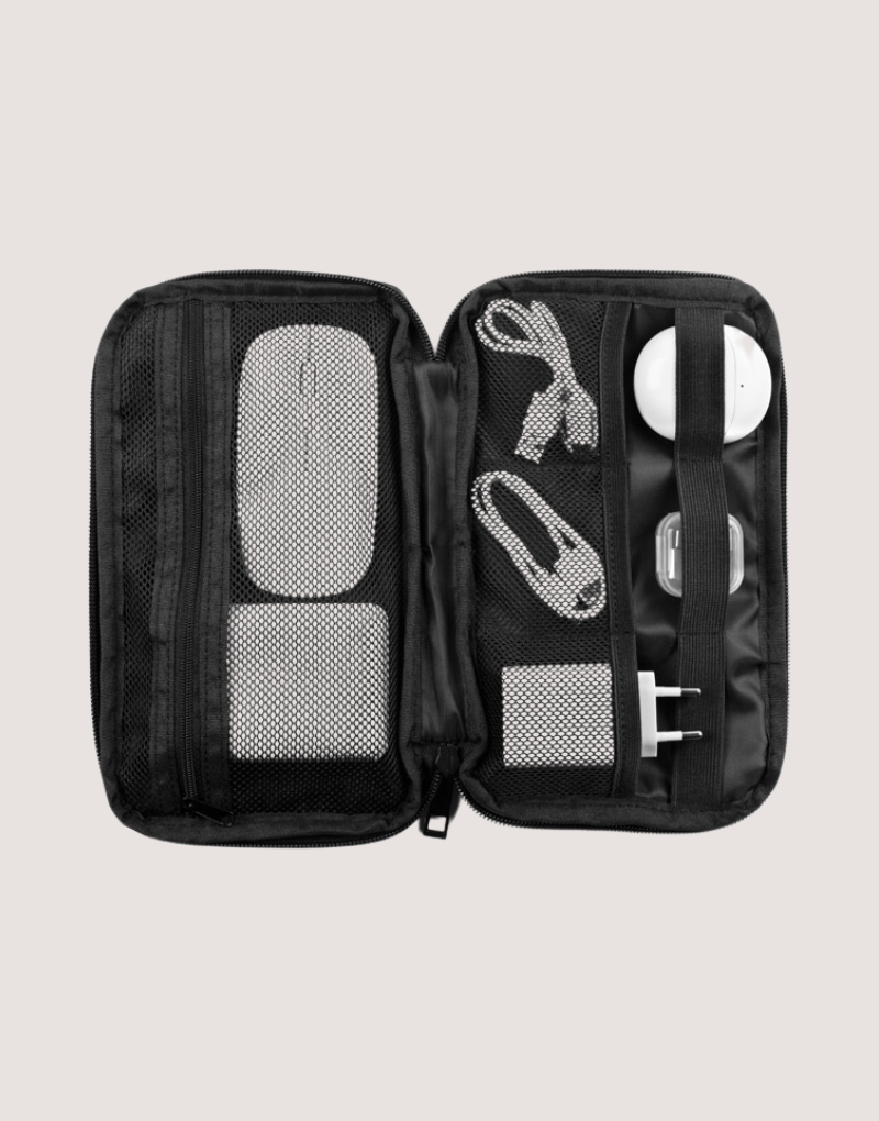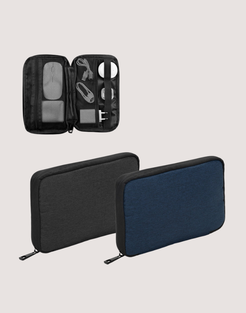 Bolsa organizadora para acessórios tecnológicos, recomendada para cabos, carregadores e pequenos dispositivos. Composta por poliéster reciclado 600D de alta densidade e forro em poliéster reciclado 210D. O compartimento principal contém vários bolsos para organizar individualmente todos os seus acessórios de maneira personalizada e funcional.