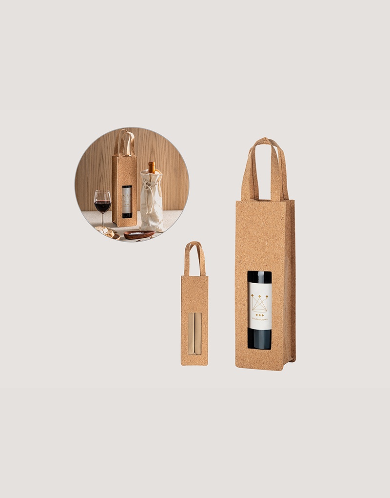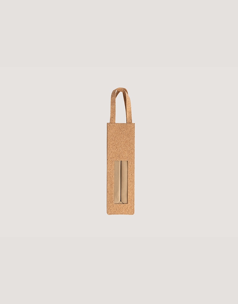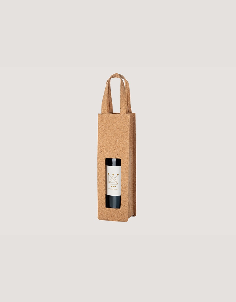 Sacola em cortiça para 1 garrafa. Sacola amiga do ambiente com 2 alças e janela na parte frontal, ideal para oferta. A cor e o resultado da impressão nos materiais naturais pode variar entre produtos.