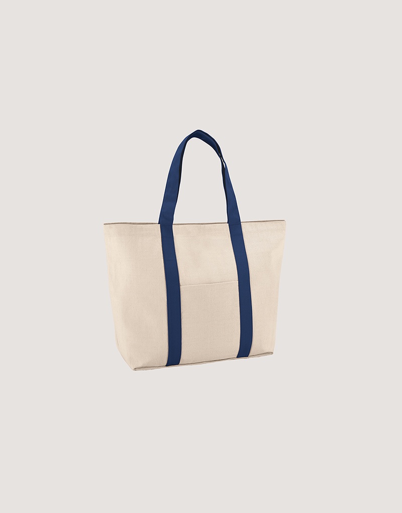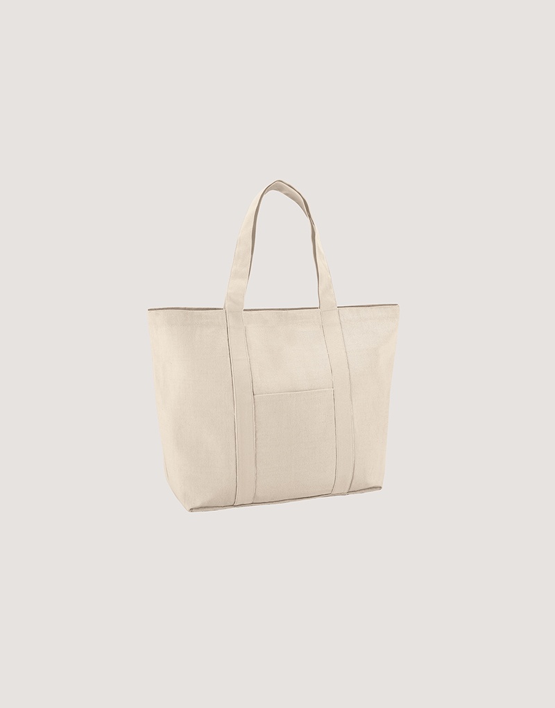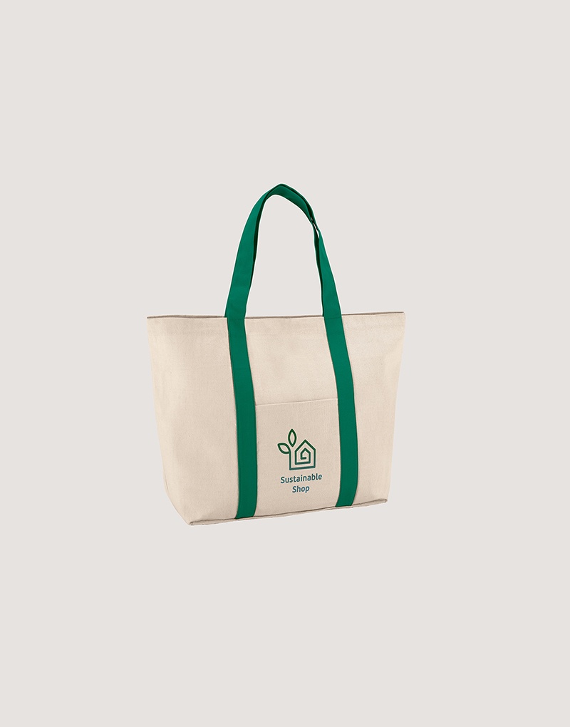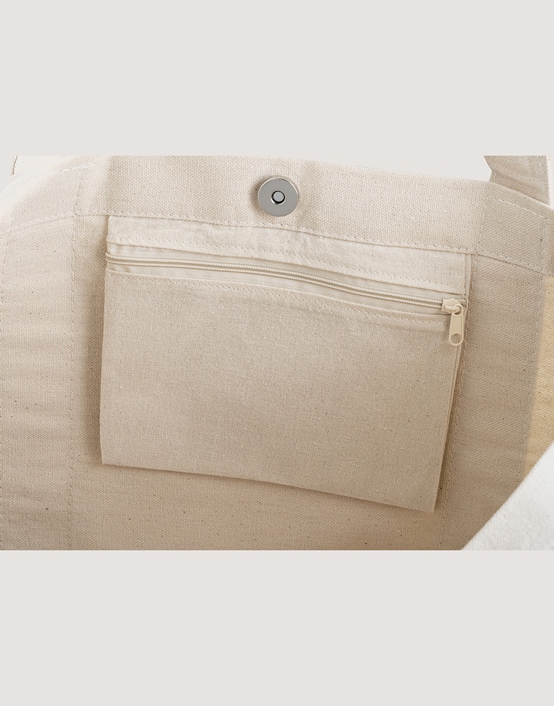 Sacola 100% algodão canvas (280 g/m²) com bolso frontal, alças de 60 cm e bolso interior com zíper. A sacola contém fecho magnético