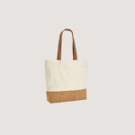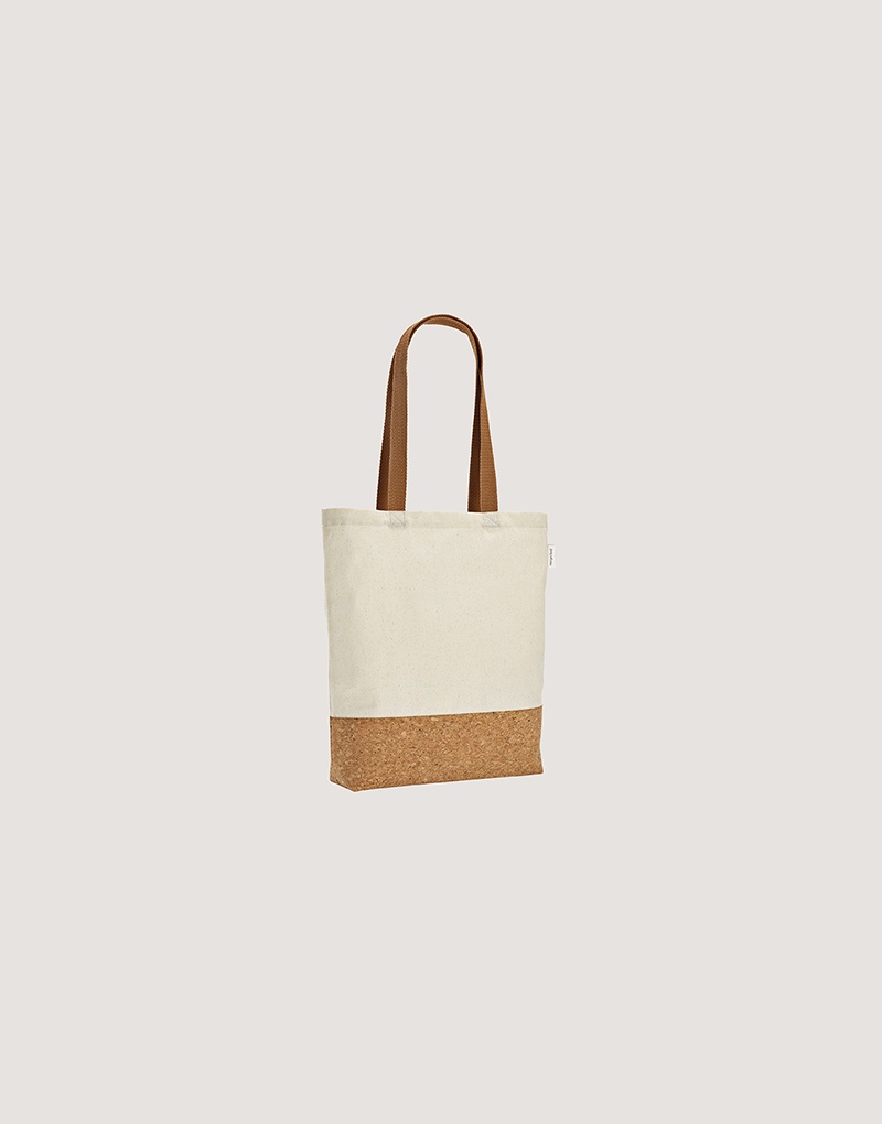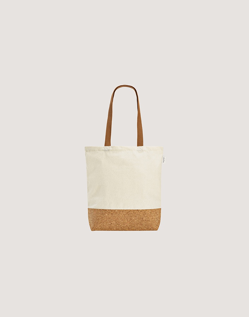Sacola em 70% algodão reciclado e Alças em webbing com 65 cm 30% poliéster reciclado (180 g/m²) com fundo em cortiça.