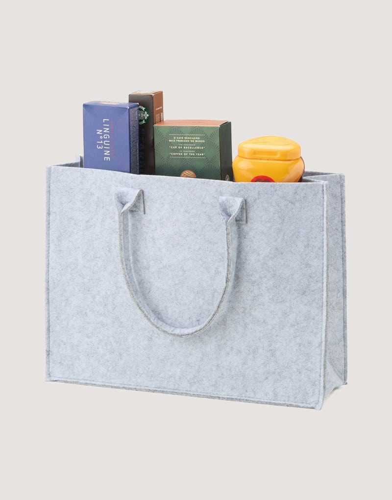 Sacola feita de feltro, trazendo o conforto ideal para acomodar cada um dos seus itens, com um ótimo espaço interno e alças para transporte costuradas internamente.