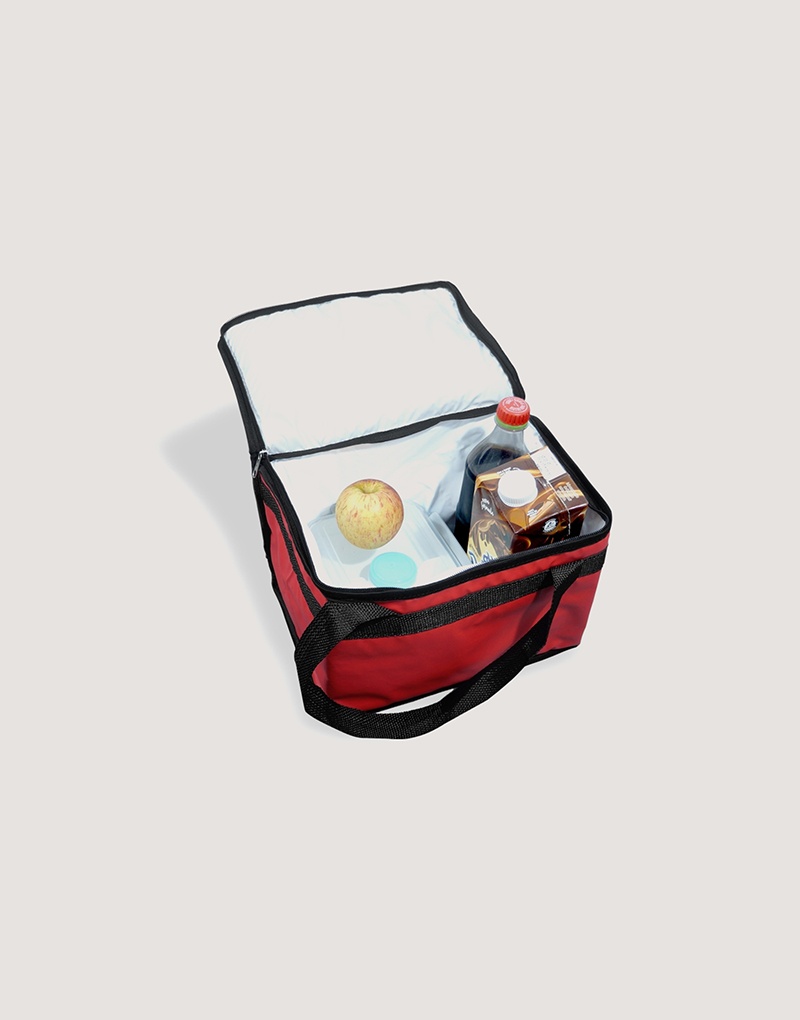 Descrição: Bolsa térmica 13 litros confeccionada em bagum sintético, contém revestimento interno em polietileno atóxico soldado (não vaza) e alça para mãos em polipropileno.