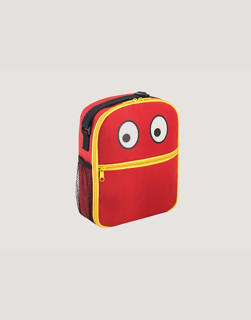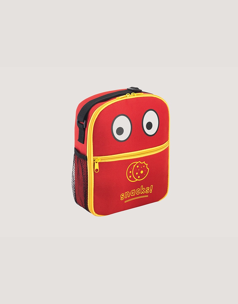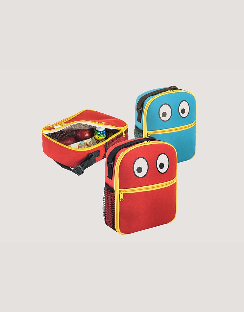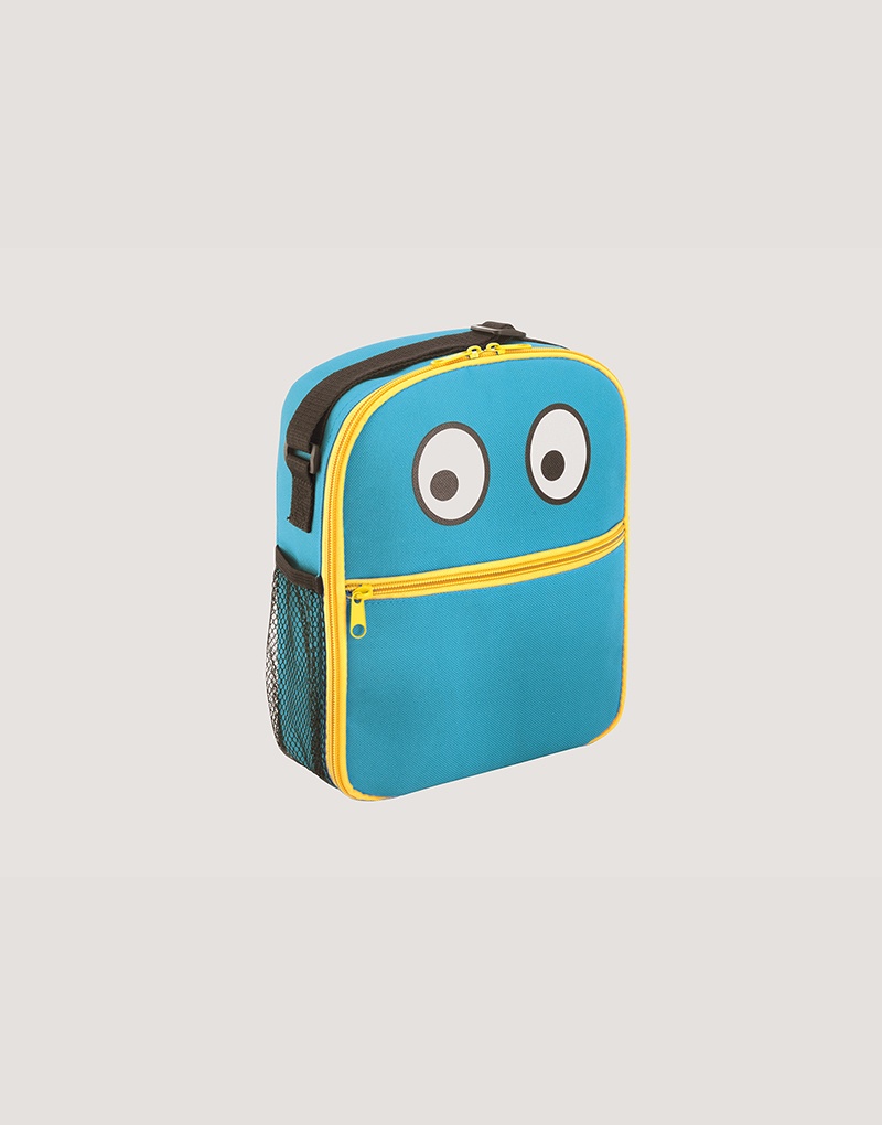 Bolsa térmica para criança em 600D com bolso frontal, fechamento com zíper e bolso lateral em tela mesh. Contém alça ajustável em webbing e tem capacidade até 3 L. Certificação EU Food Grade.