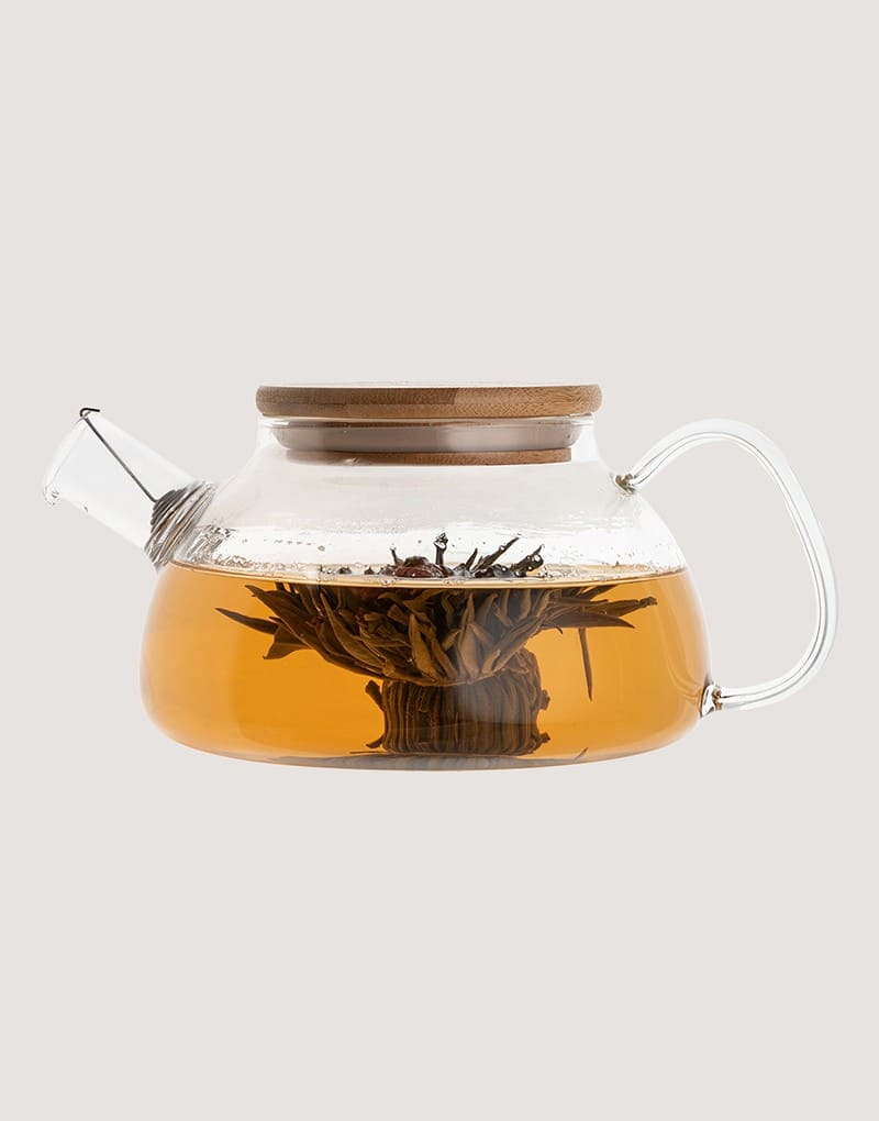 Bule de vidro borossilicato com tampa em bambu. Incluso infusor em aço inox. Capacidade até 750mL. Fornecido em caixa presente de papel kraft. Certificação EU Food Grade. A cor e o resultado da impressão nos materiais naturais pode variar entre produtos.