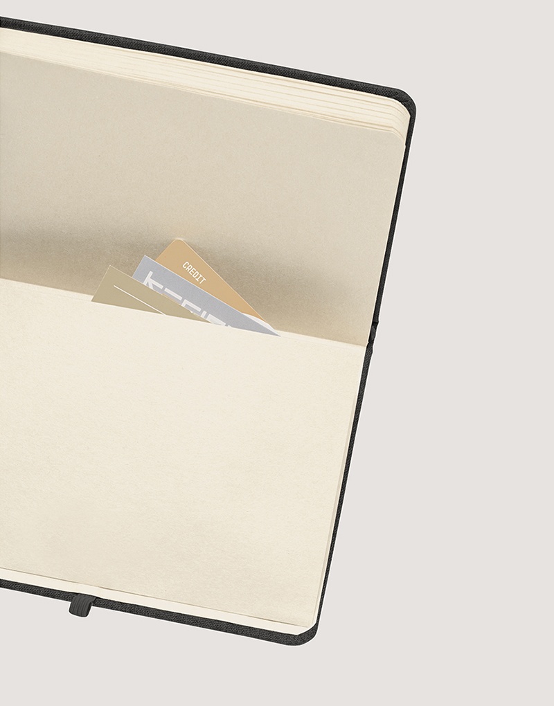 Caderno A5 de capa dura em couro reciclado, com 96 folhas pautadas cor marfim em papel proveniente de gestão florestal sustentável. Suporte para esferográfica (não inclusa), elástico e fita separadora em preto. Contém bolso interior. Fornecido em envelope preto de cartão.