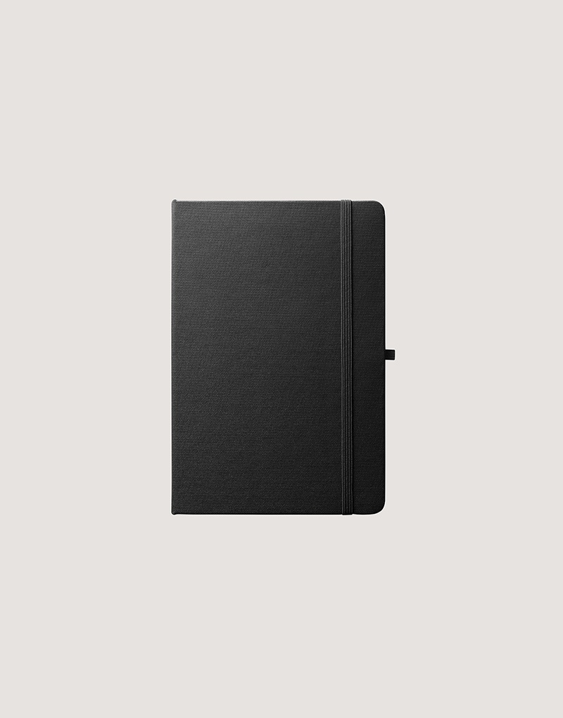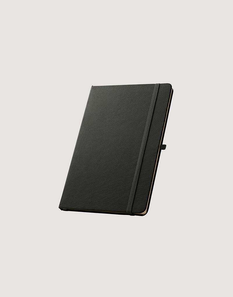 Caderno A5 de capa dura em poliéster 100% reciclado (100% rPET) 300D, com cantos redondos. Contém 80 folhas pautadas em papel cor de marfim reciclado, fita separadora, suporte para esferográfica (não inclusa) e elástico para fecho do caderno. Na parte inferior da lombada, tem impresso em branco o símbolo do rPET.