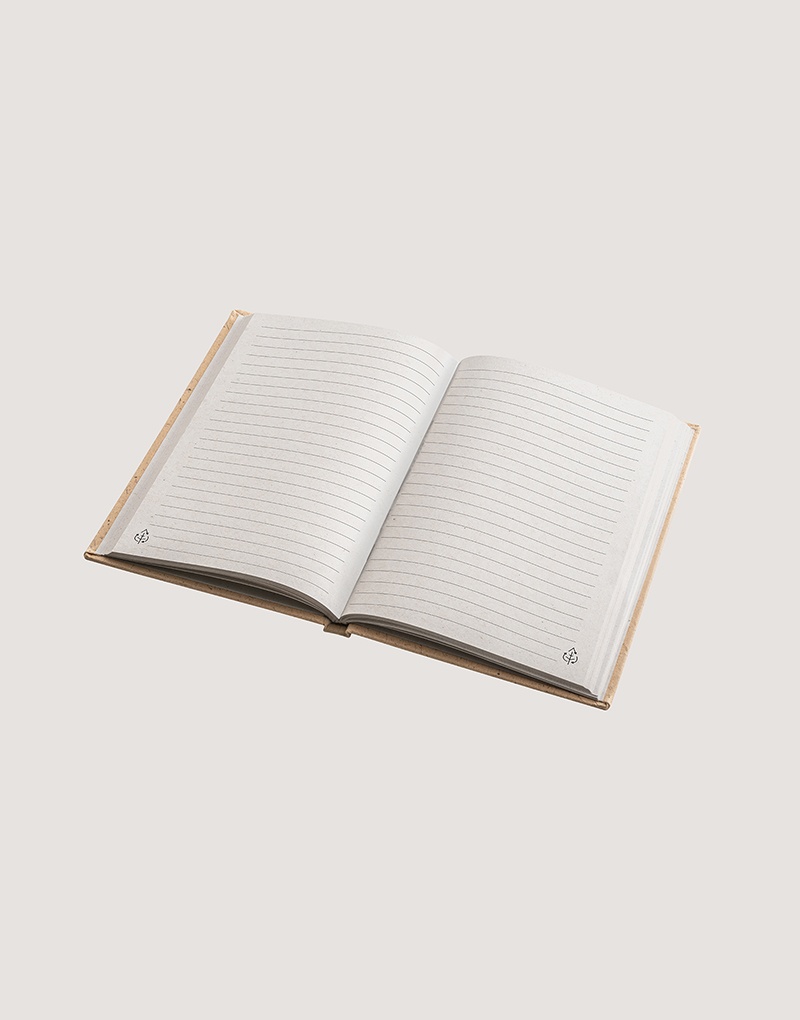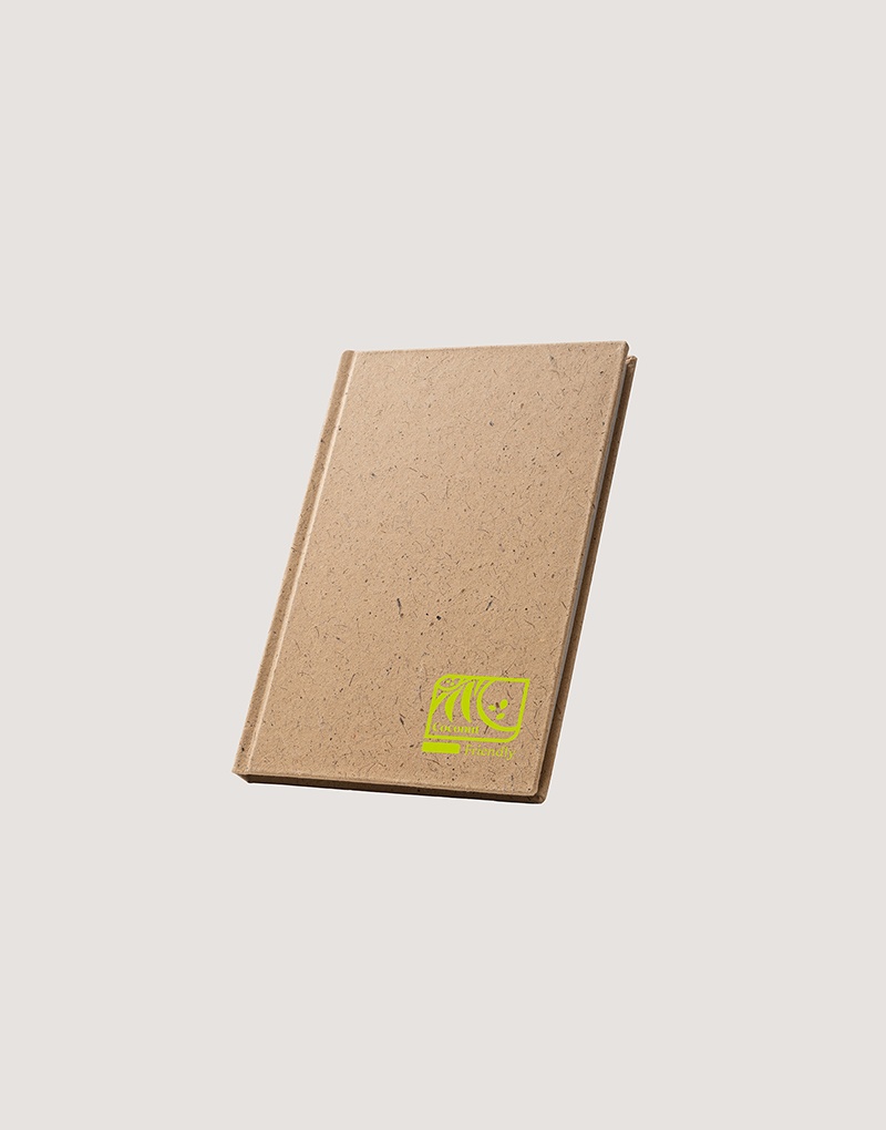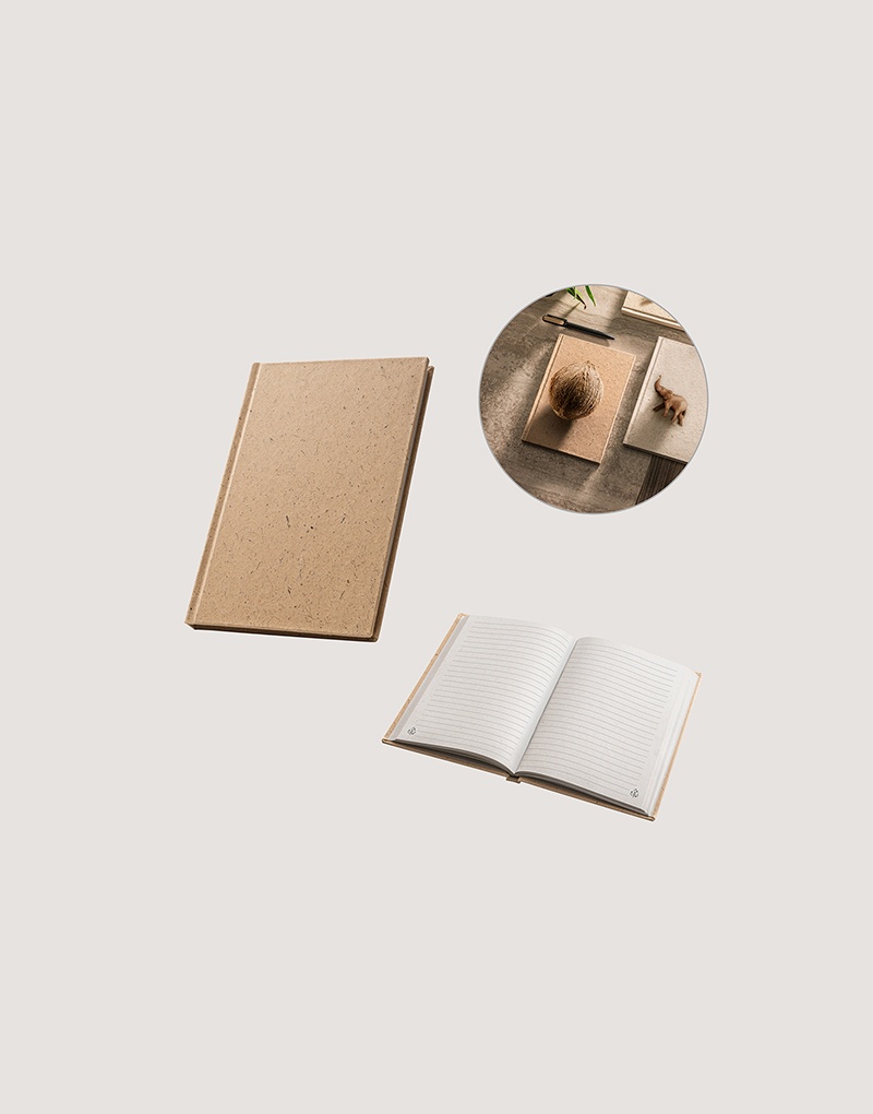 Caderno A5 de capa dura em casca de coco (60%) e pedaços de algodão reciclado (40%). O interior com 80 folhas pautadas de papel coco 100% reciclado. Um caderno que se distingue por dar uma segunda vida a materiais que podem ser reciclados.