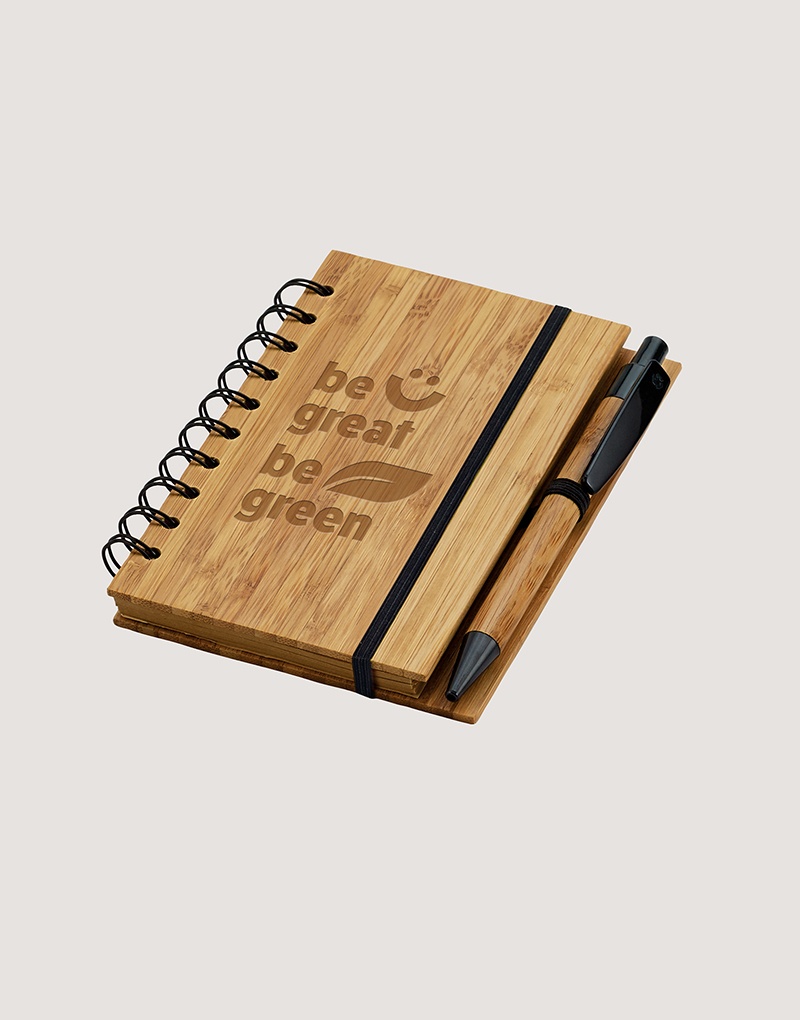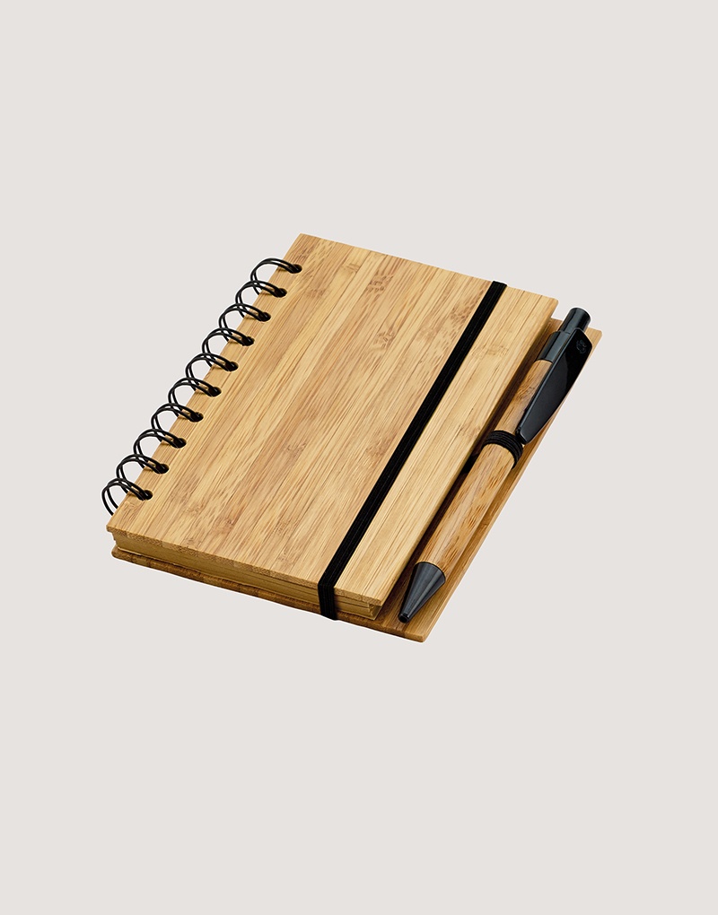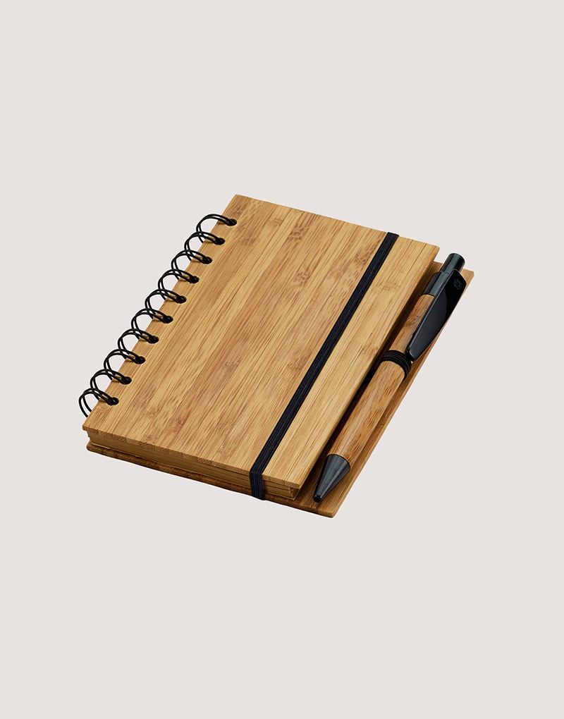 Caderno A6 espiral de capa dura em bambu. Com 140 páginas pautadas de papel reciclado e suporte para esferográfica. Esferográfica em bambu inclusa. A cor e o resultado da impressão nos materiais naturais pode variar entre produtos.