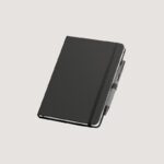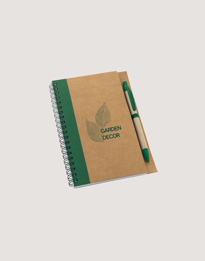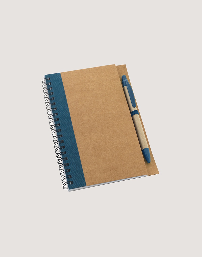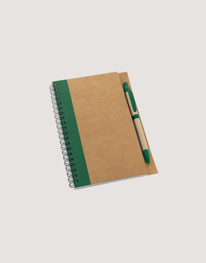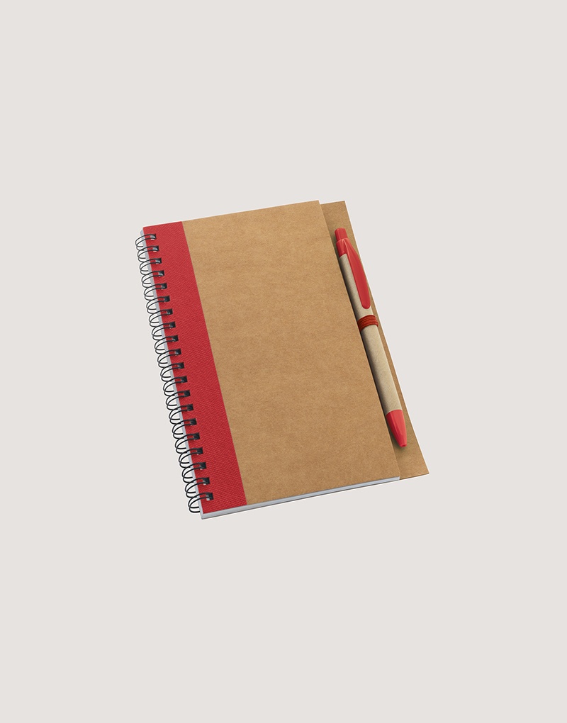 Caderno B6 espiral de capa dura em cartão, com 120 páginas lisas em papel reciclado e suporte para esferográfica (inclusa).