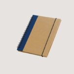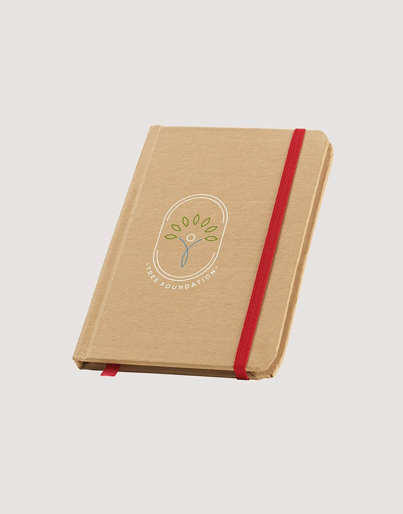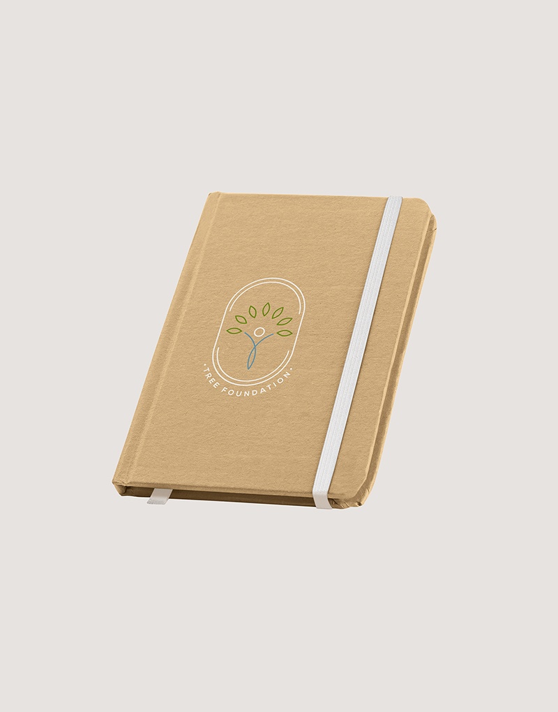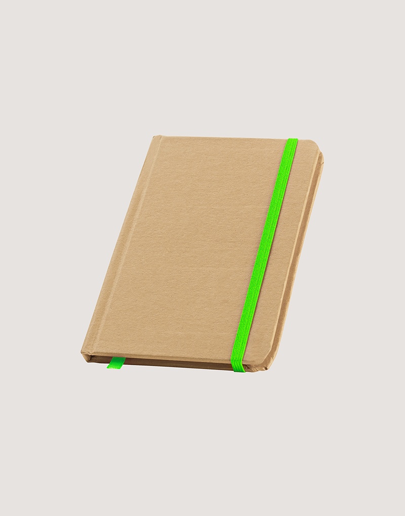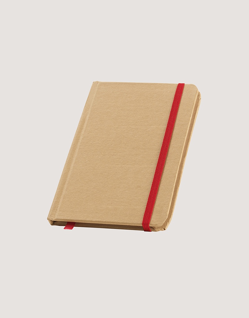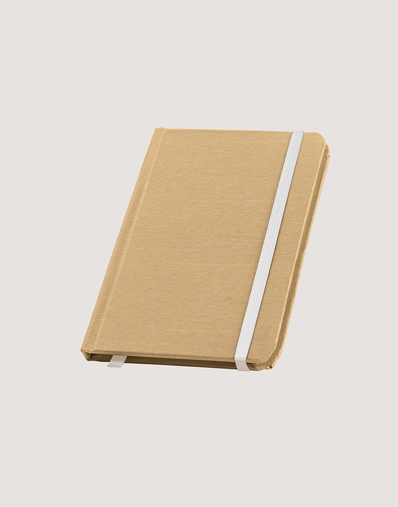 Caderno de bolso de capa dura em cartão, com 160 páginas lisas em papel reciclado. Contém elástico e fita separadora.