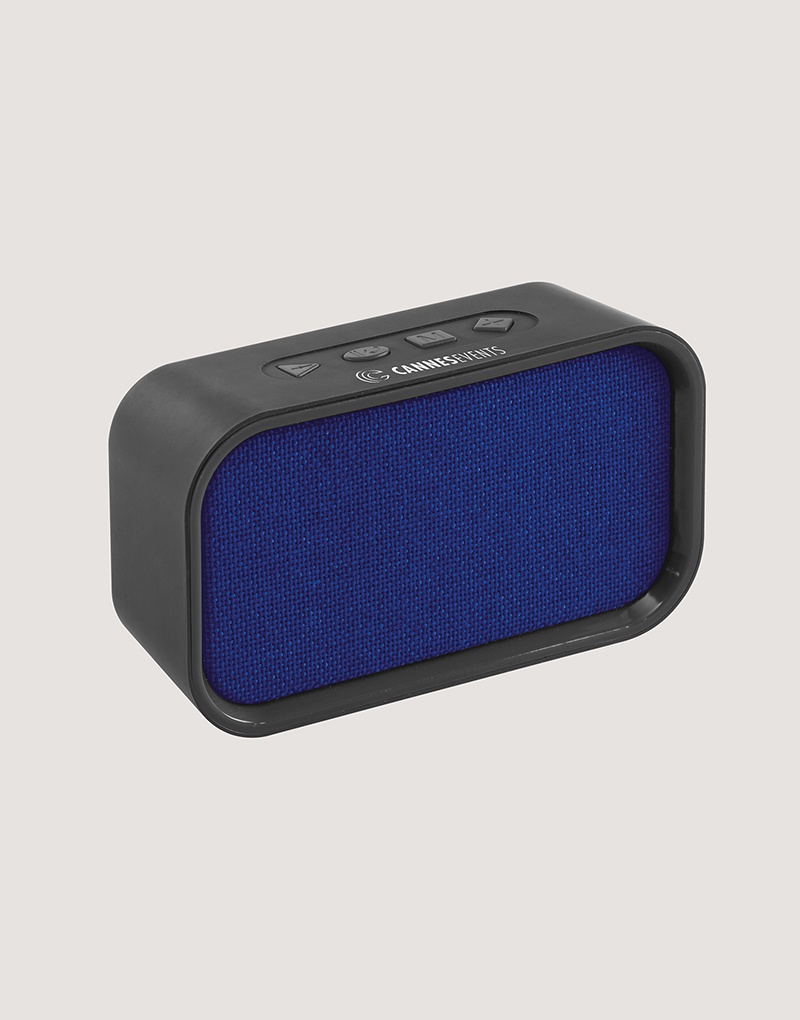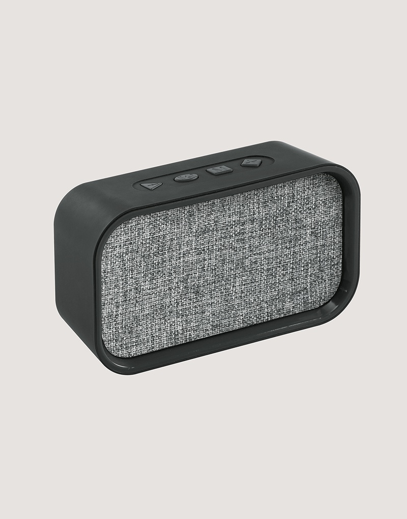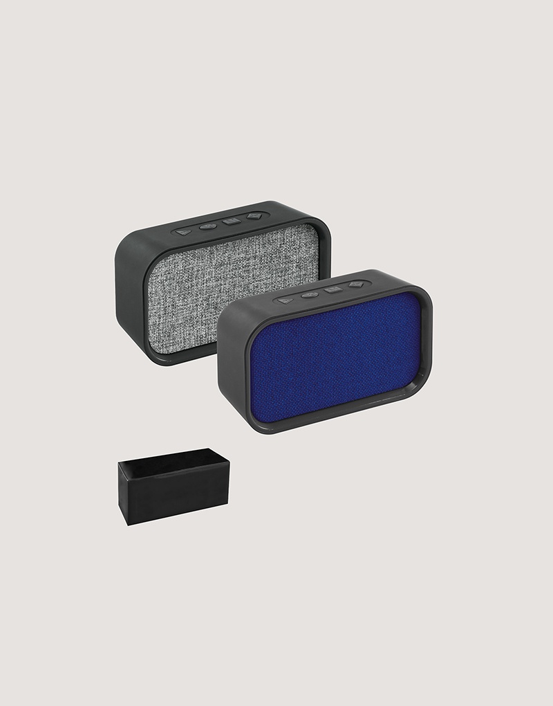 Caixa de som portátil com microfone, em ABS, tecido em poliéster e acabamento emborrachado. Transmissão sem fios BT v4.2, ligação stereo 3,5 mm e leitor de cartões TF. Potência de 3W/4Ω. Autonomia aproximada de 2h. Função para atender chamadas, controle de volume, conexão à playlist do dispositivo móvel e rádio FM. Incluso cabo USB para carregar. Fornecida em caixa presente.