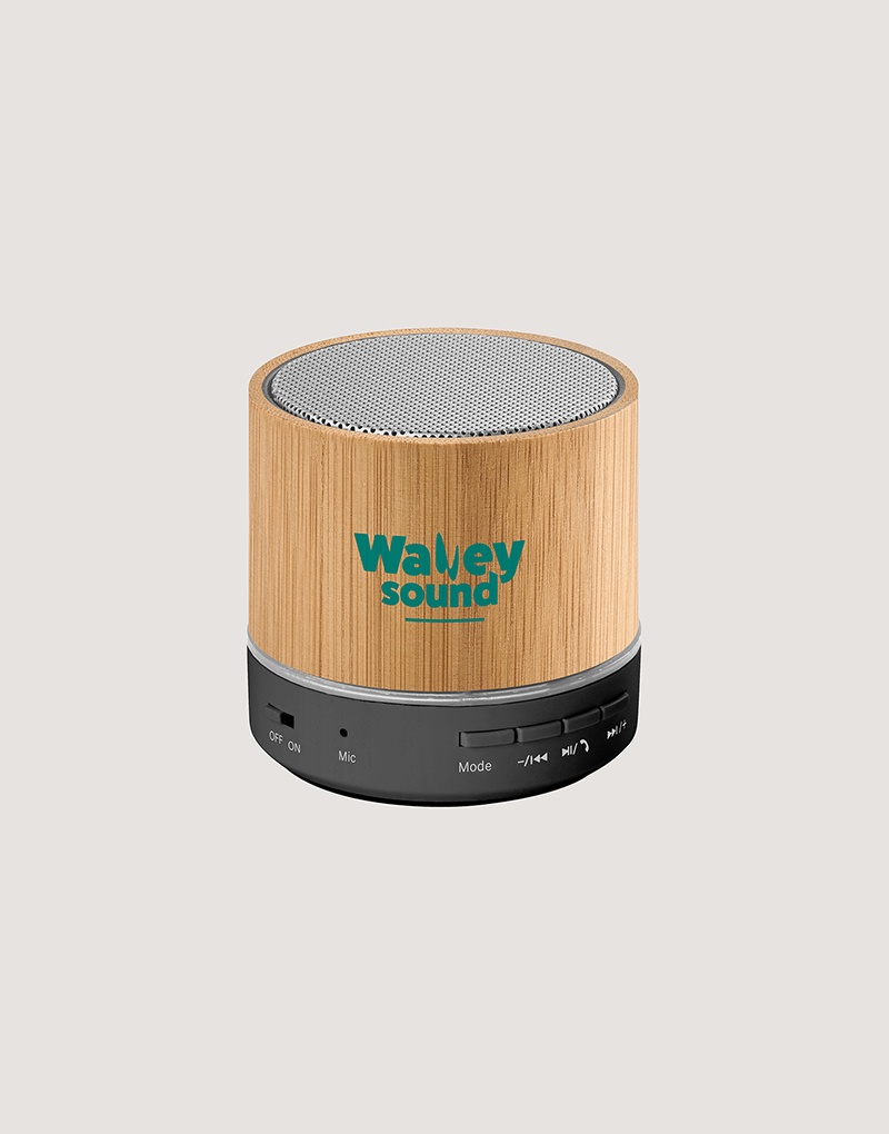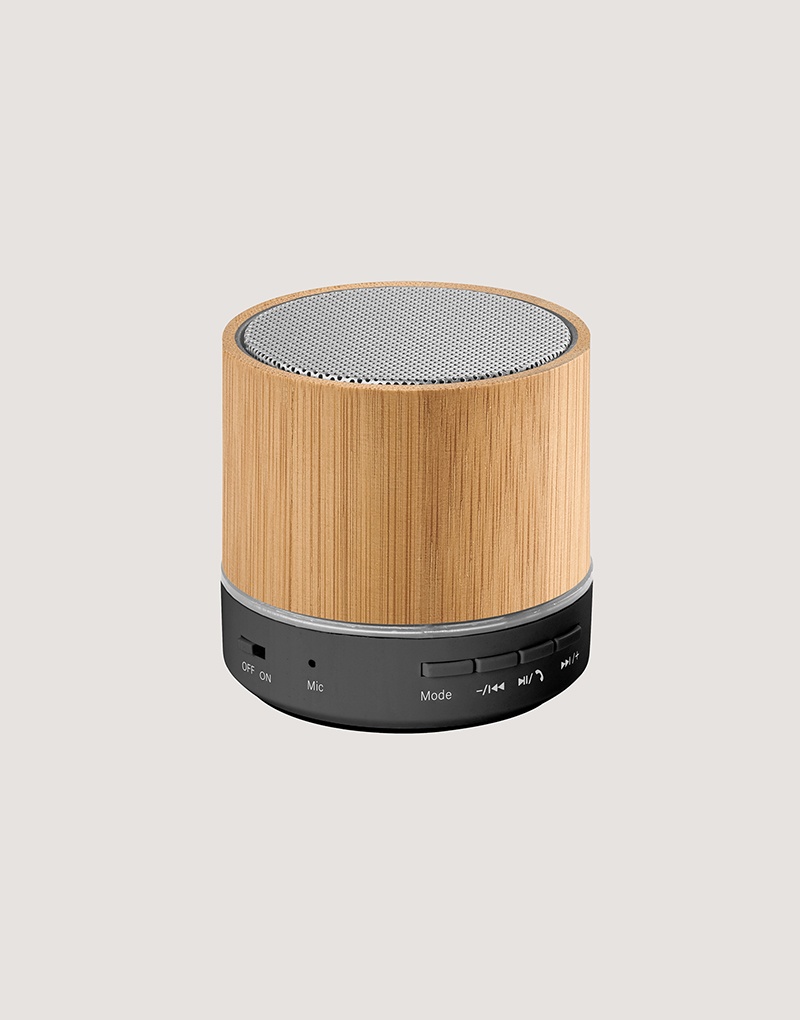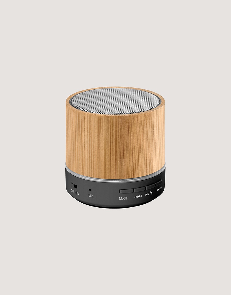 Caixa de som portátil com microfone, em bambu e ABS 100% reciclado, com transmissão sem fios BT 5.3. Tem potência de 3W, bateria com 400 mAh e autonomia aproximada de 4h30. Permite ainda as funções de atender chamadas, leitor de cartões microSD, entrada AUX e reprodução automática via porta USB-A. Incluso cabo de carregamento USB. Fornecido em caixa presente de papel kraft que pode ser reutilizada como suporte de celular. A grelha é fornecida solta para pedidos não personalizados. A cor e o resultado da impressão nos materiais naturais pode variar entre produtos.