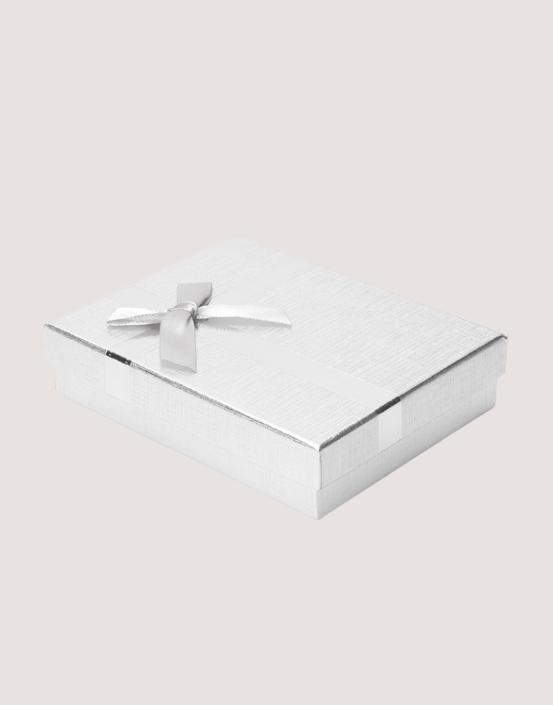 Caixa para presente feita em papelão com acabamento levemente texturizado e laço decorativo em cetim colado na tampa. Conta ainda com berço removível em espuma com ranhuras.