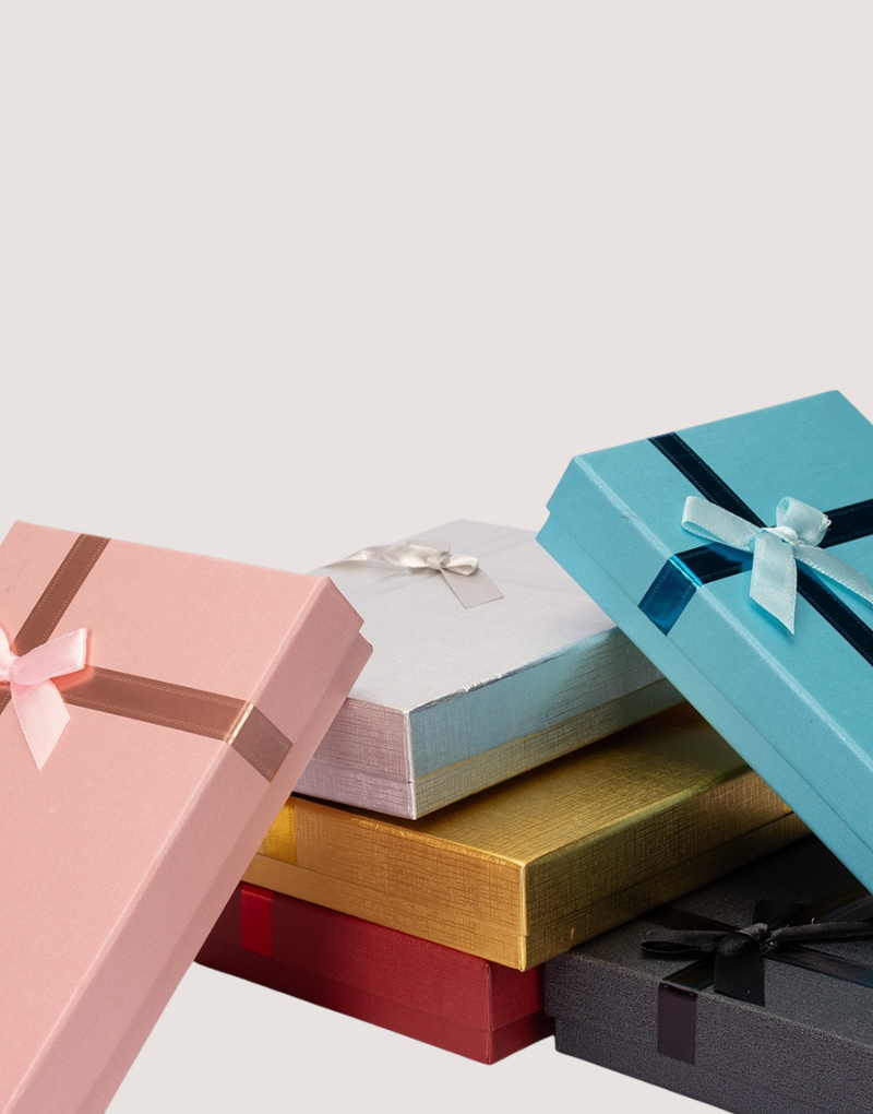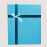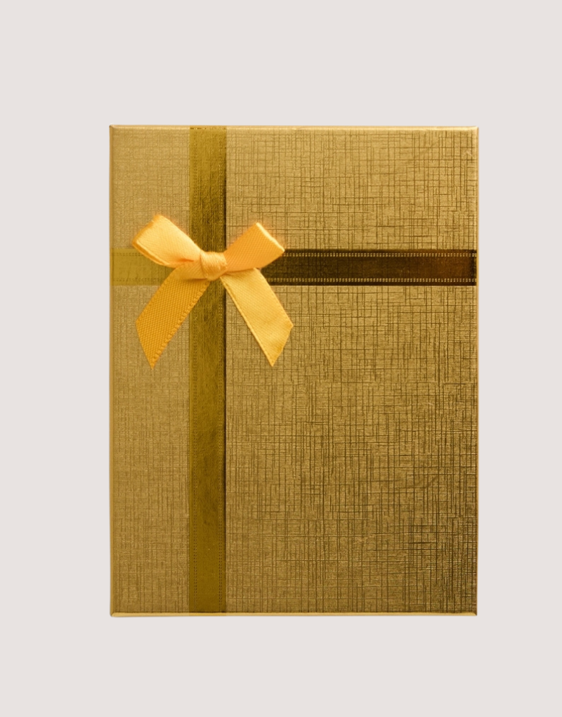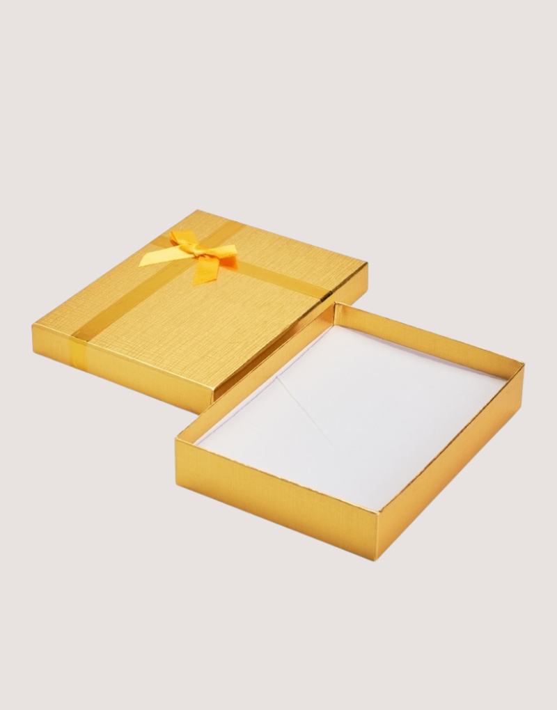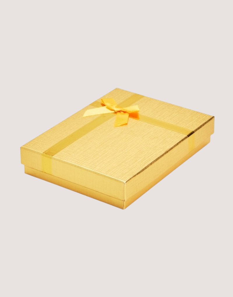 Caixa para presente em papelão com acabamento levemente texturizado e laço decorativo de cetim colado na tampa. Conta ainda com berço removível em espuma com ranhuras.