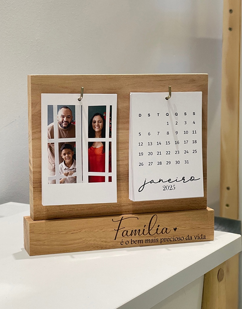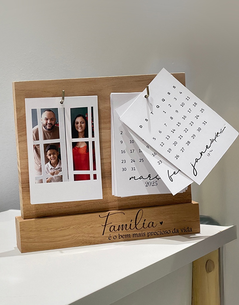 Para eternizar momentos ao longo do ano. Esse calendário permite alternar fotos personalizadas e folhas de calendário em uma estrutura de madeira elegante. Perfeito para ações de fim de ano, brindes afetivos ou campanhas que valorizam histórias reais.