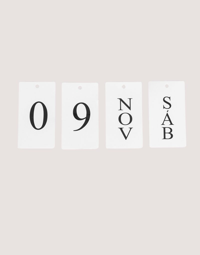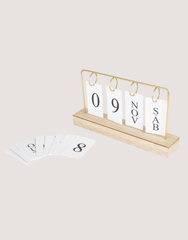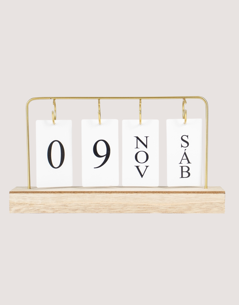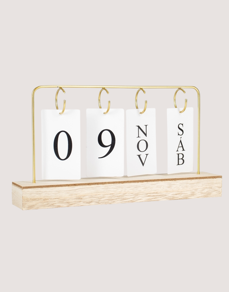 Calendário permanente de mesa com base feita em MDF e moldura de ferro. Conta com fichas em papel cartão que permitem montar a data, trazendo o dia em números e o mês e os dias da semana em versões abreviadas.