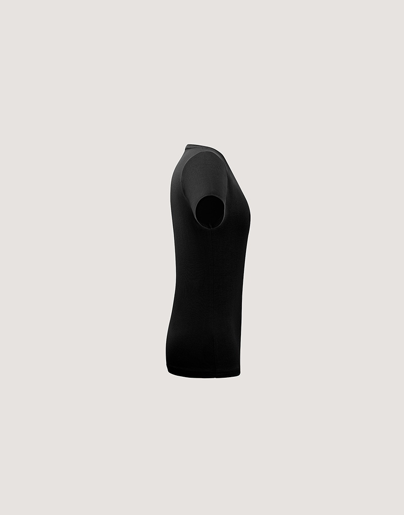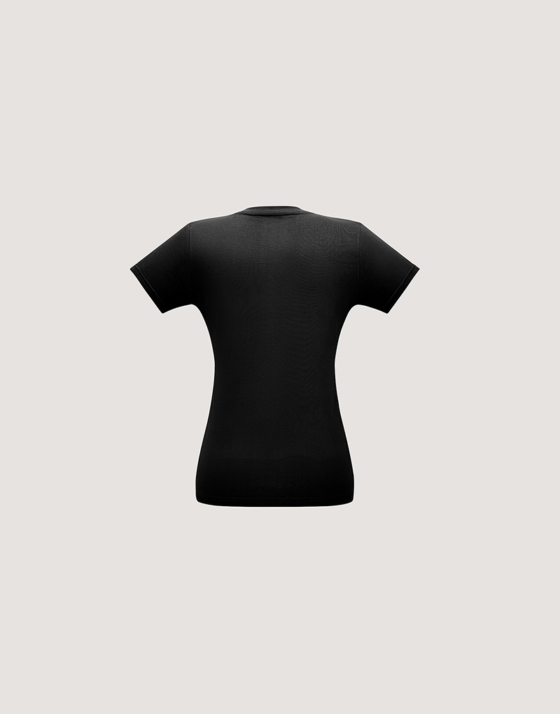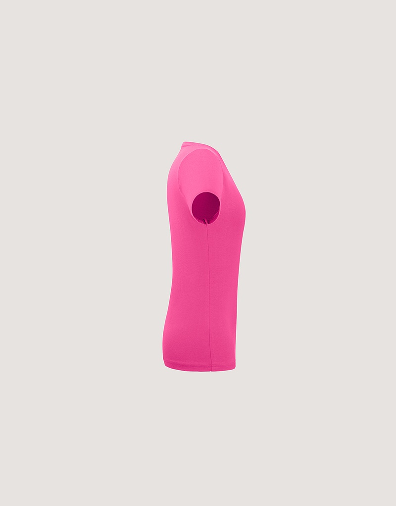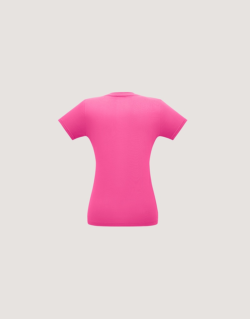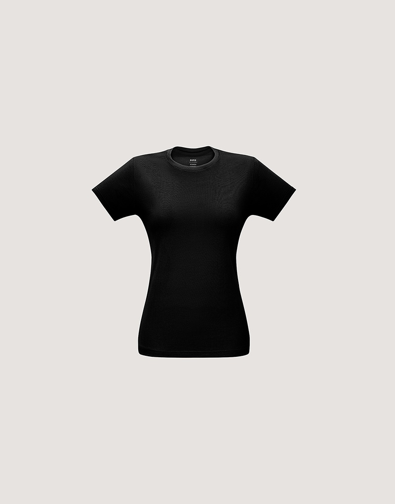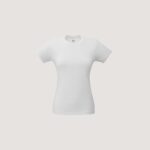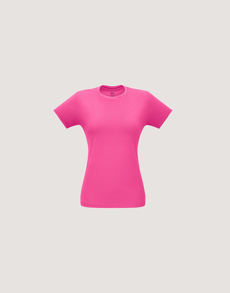 Camiseta feminina de corte cinturado em malha 100% algodão (170 g/m2) com fio 30/1 penteado. Com gola em ribana 1×1 com fita de reforço e com costura dupla nas mangas, barra de fundo e laterais. Produto contém certificação ABVTEX .