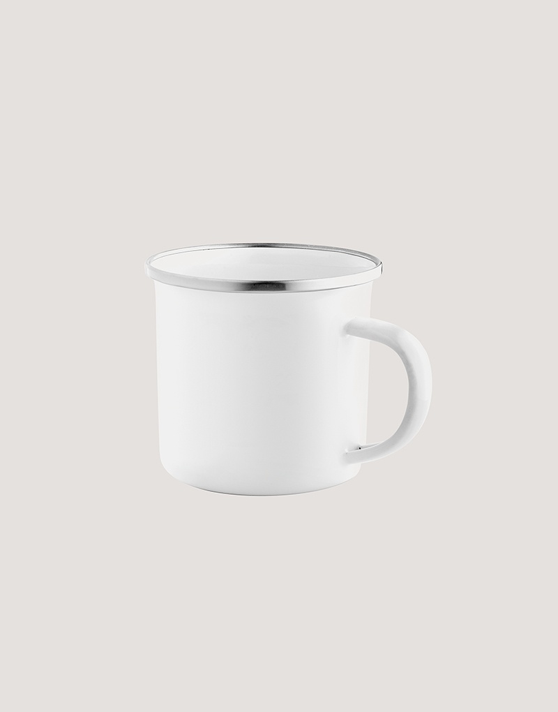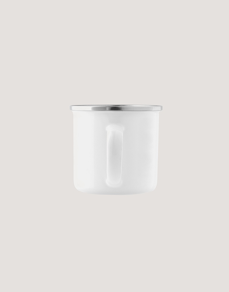 Caneca em esmalte para sublimação. Capacidade até 350 mL. Fornecida em caixa presente branca. Certificação EU Food Grade.