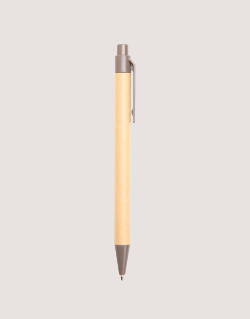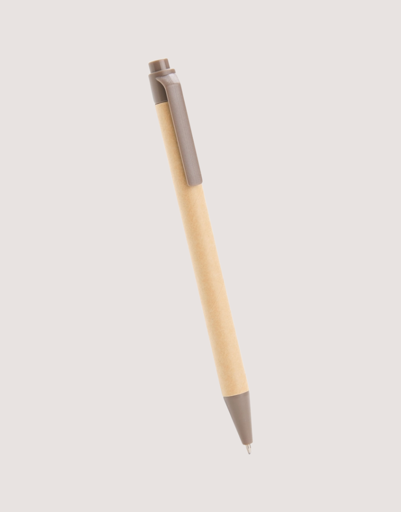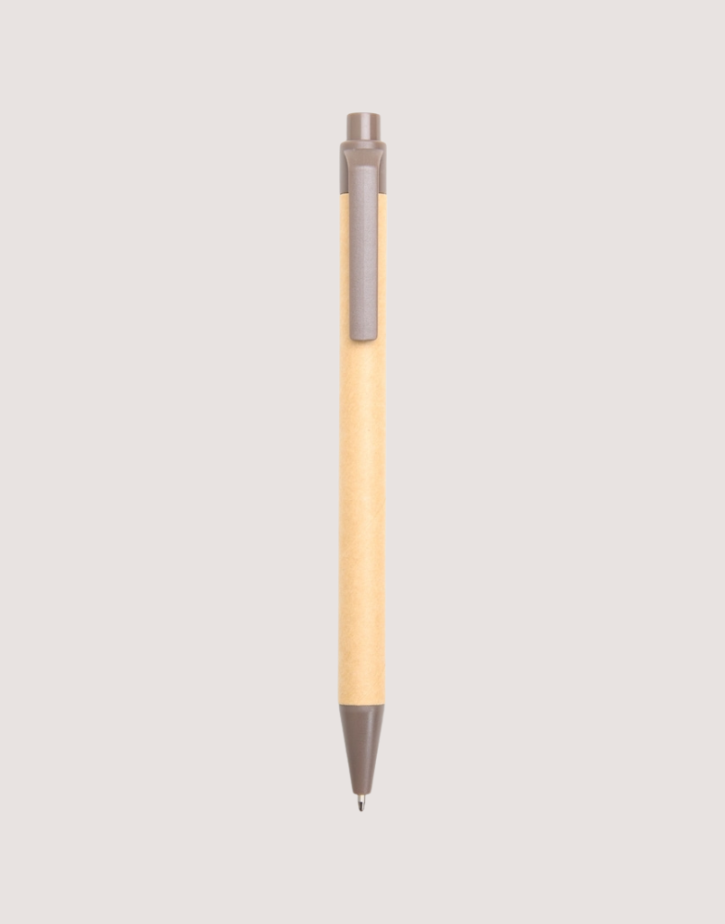 Caneta com corpo em papelão, ponteira e clip em plástico ABS, com acionamento por clique e carga esferográfica azul de 1,0mm.