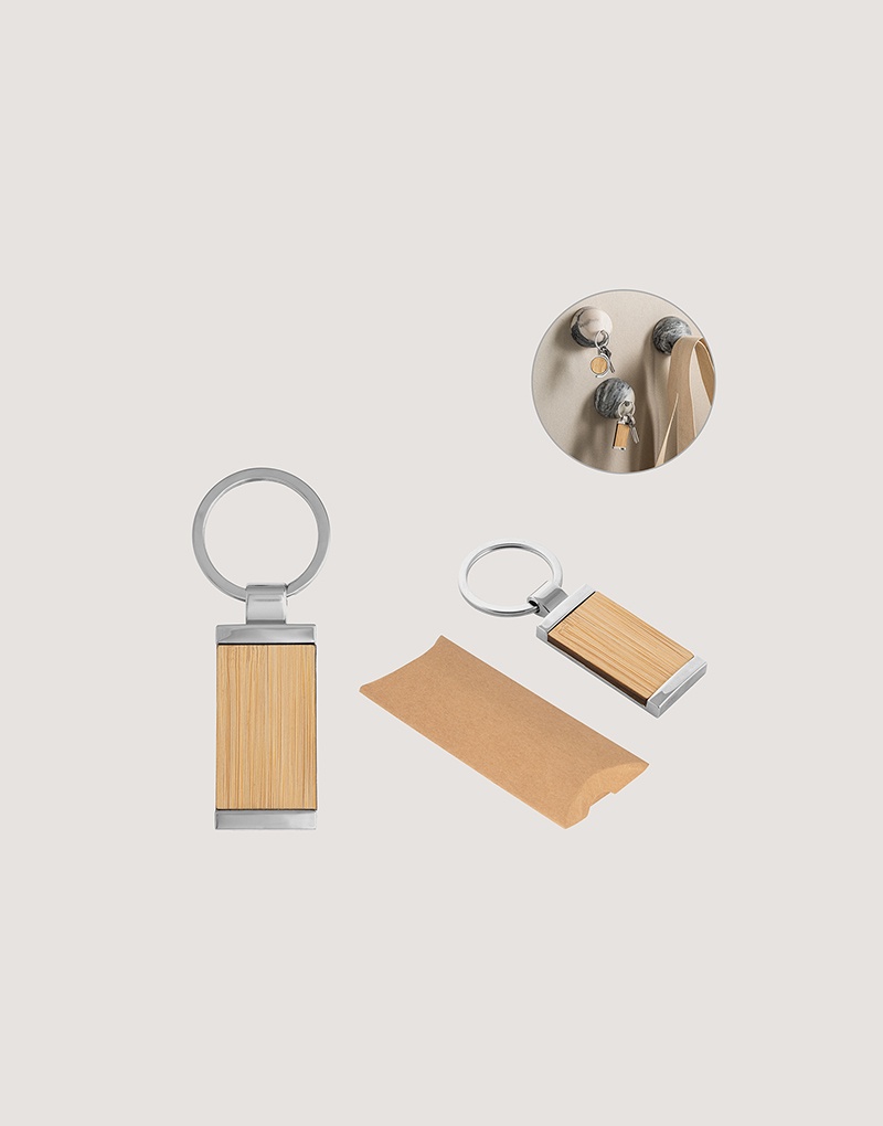 Chaveiro retangular em bambu com revestimento em metal. Fornecido com bolsa em cartão kraft. A cor e o resultado da impressão nos materiais naturais pode variar entre produtos.