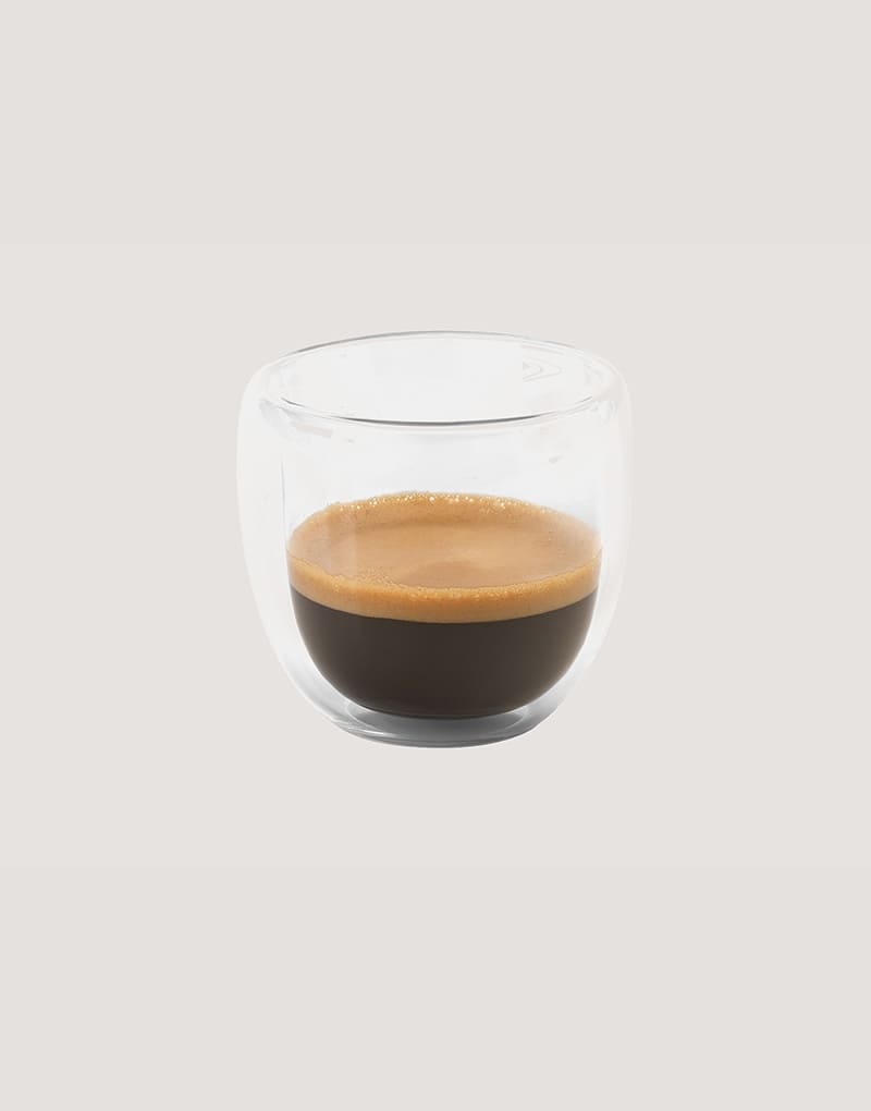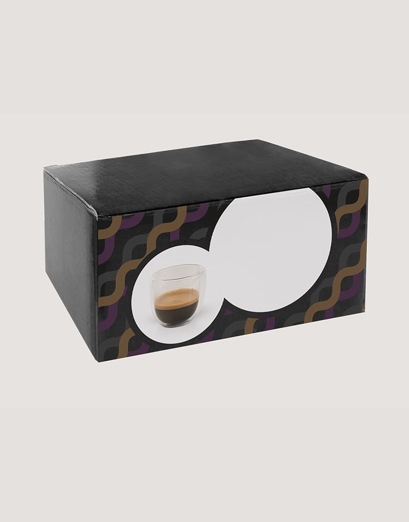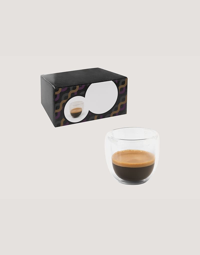 Conjunto de café em vidro isotérmico (borossilicato) com 2 copos com parede dupla isolada a ar e capacidade até 75 mL. Fornecido em caixa presente personalizável. Certificação EU Food Grade.