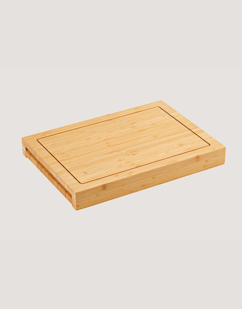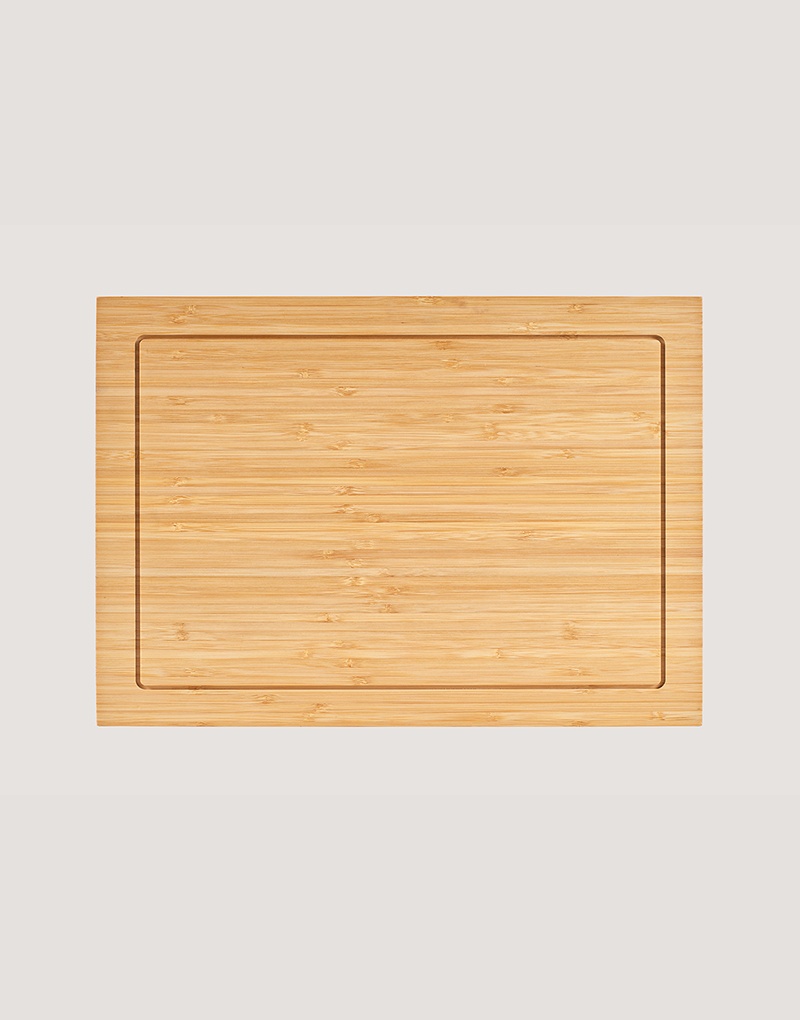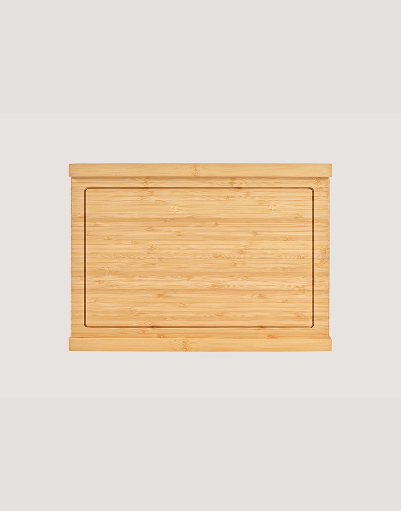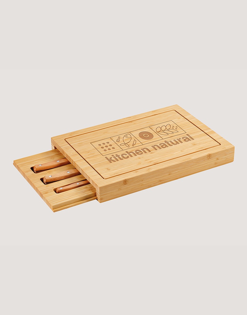 Conjunto de tábuas em bambu com 3 facas inclusas. Composto por duas tábuas: a tábua exterior e a tábua interior que assume duas funcionalidades – um compartimento para três facas inclusas (faca de legumes, faca de pão, faca de cozinha) e como tábua de corte. Fornecida em caixa presente em papel kraft reciclado. Certificação EU Food Grade. A cor e o resultado da impressão nos materiais naturais pode variar entre produtos.