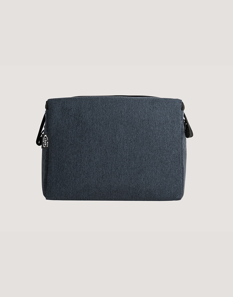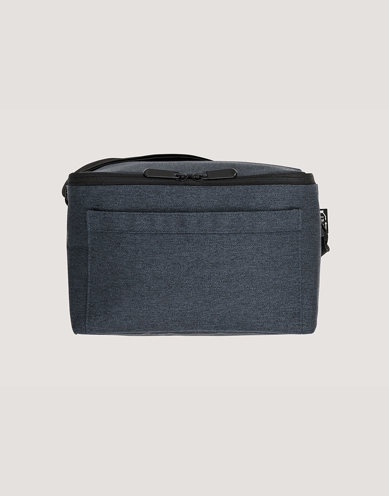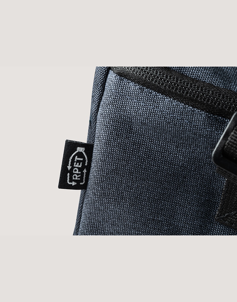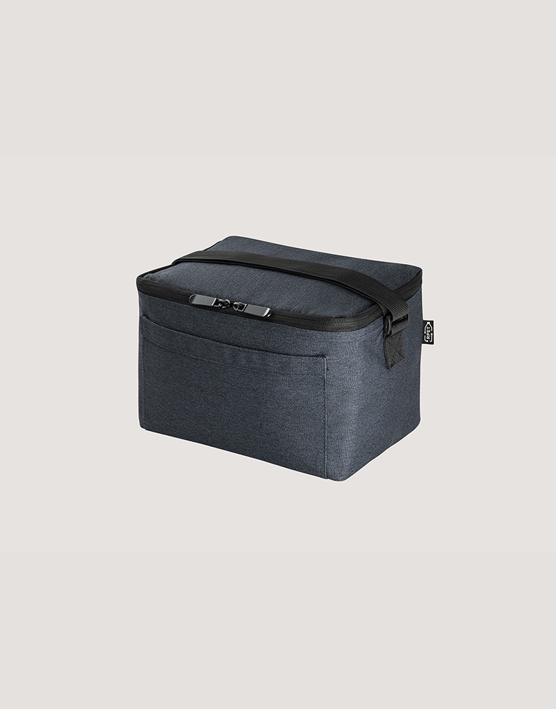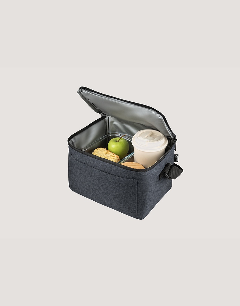 Bolsa térmica em 600D poliéster reciclado (100% rPET) com interior em PEVA. Alça ajustável em webbing, bolso frontal e fecho duplo. Capacidade até 7 L. Certificação EU Food Grade.