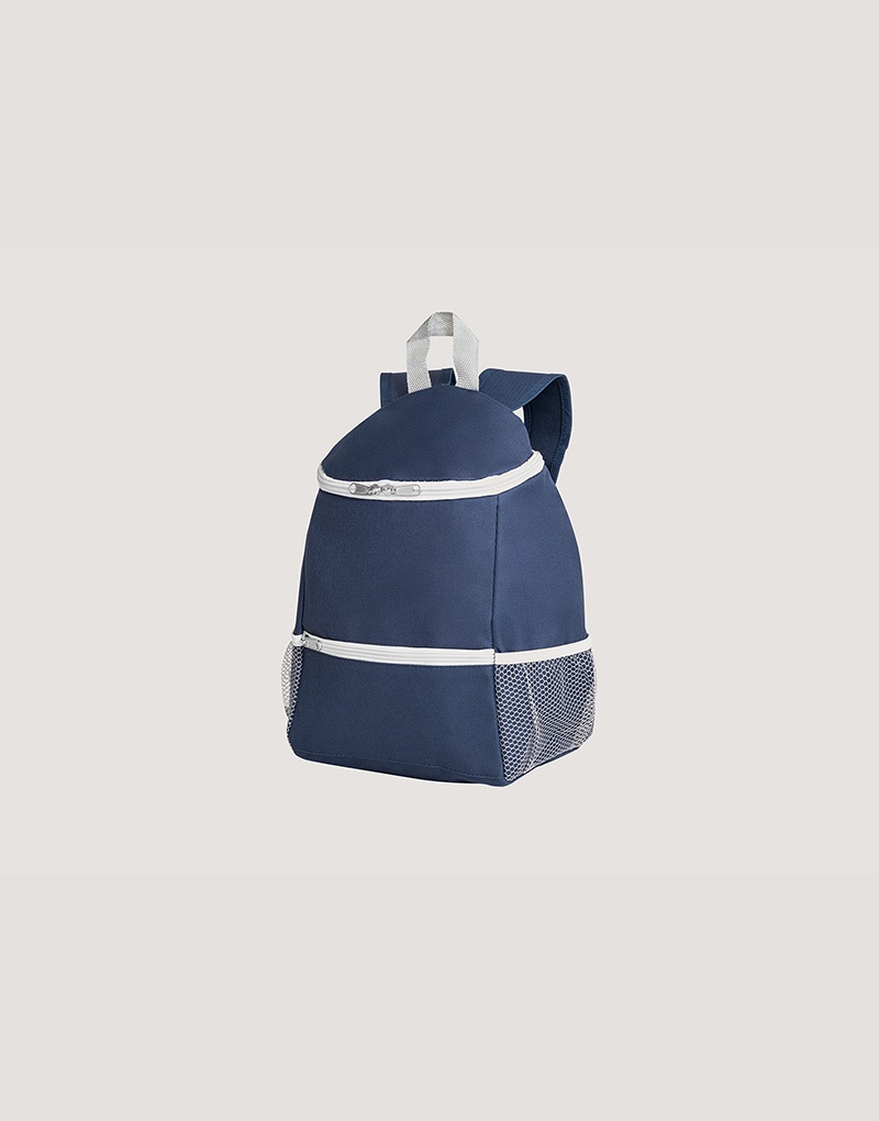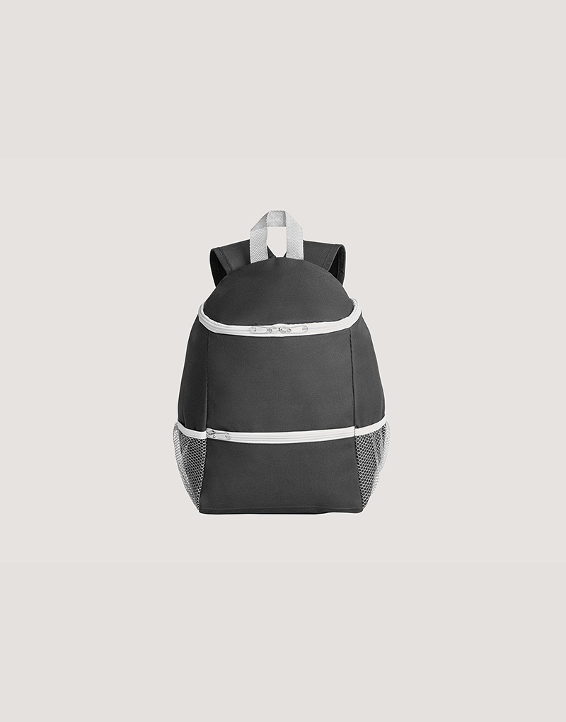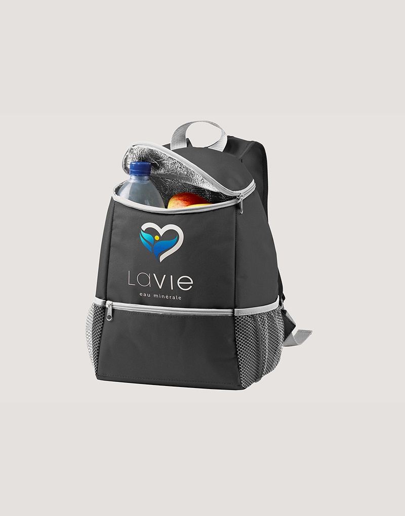 Mochila térmica em 600D com um bolso frontal com zíper e dois bolsos laterais em tela mesh. Capacidade até 10 L. Certificação EU Food Grade.