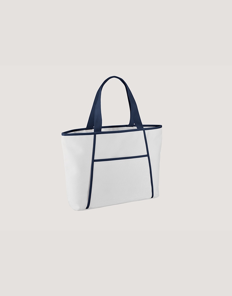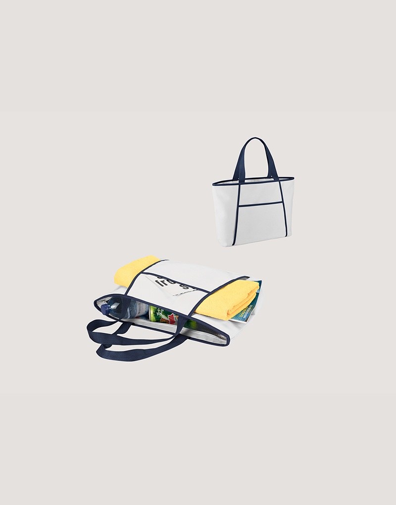 Sacola térmica em 600D com zíper e compartimento exterior aberto que contém um bolso frontal. Ideal para levar para a praia. Alças em webbing com 55 cm e capacidade até 9 L. Certificação EU Food Grade.