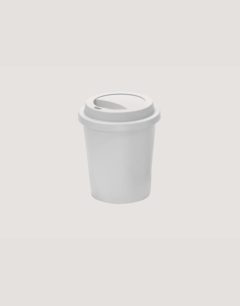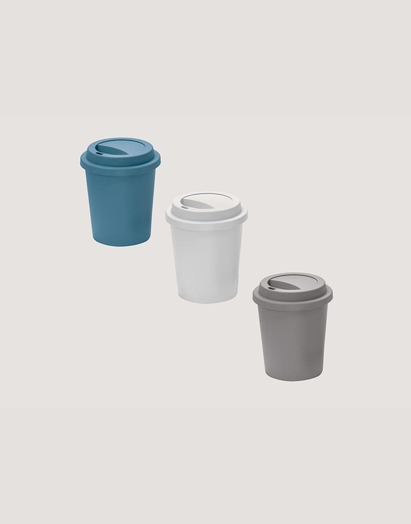 Copo de viagem com tampa e corpo em PP. Capacidade até 350 mL. Certificação EU Food Grade.