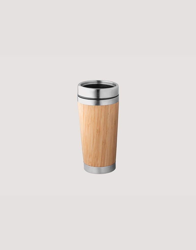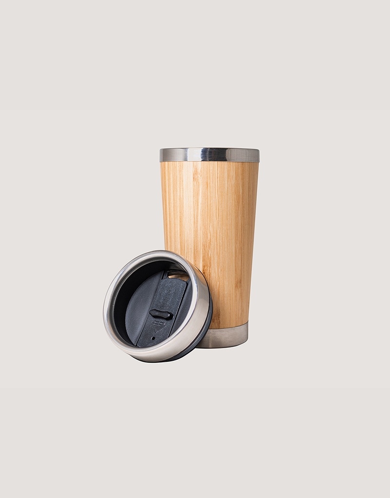 Copo de viagem em aço inox e bambu, térmico com parede dupla isolada a ar, com sistema de abertura deslizante. Capacidade até 500 mL. Preserva as bebidas quentes por 2 horas e as bebidas frias por 4 horas. Fornecido em caixa presente de papel kraft. Certificação EU Food Grade. A cor e o resultado da impressão nos materiais naturais pode variar entre produtos.