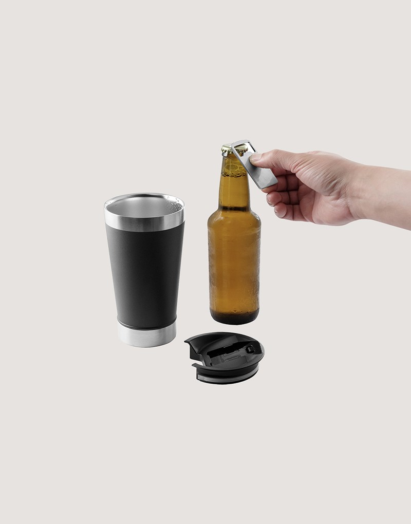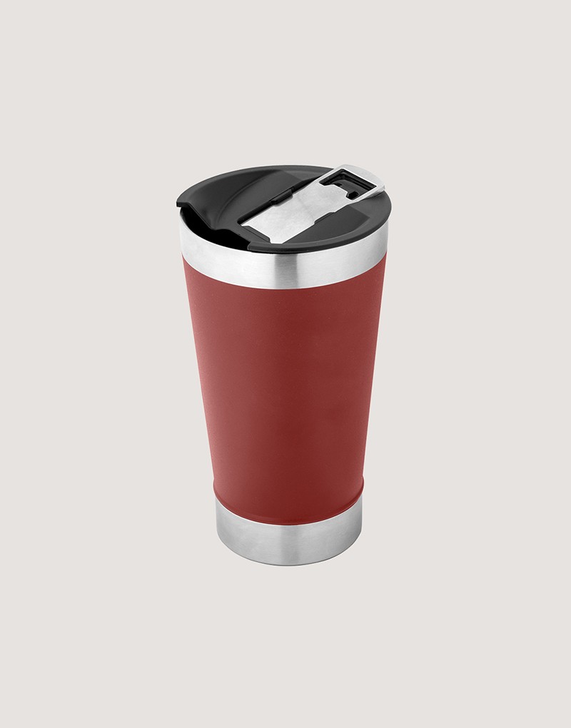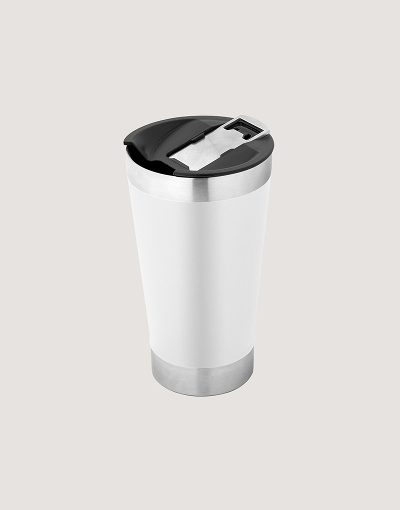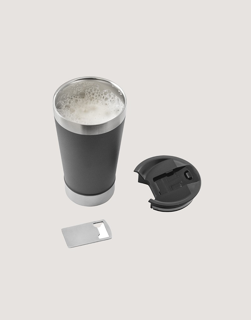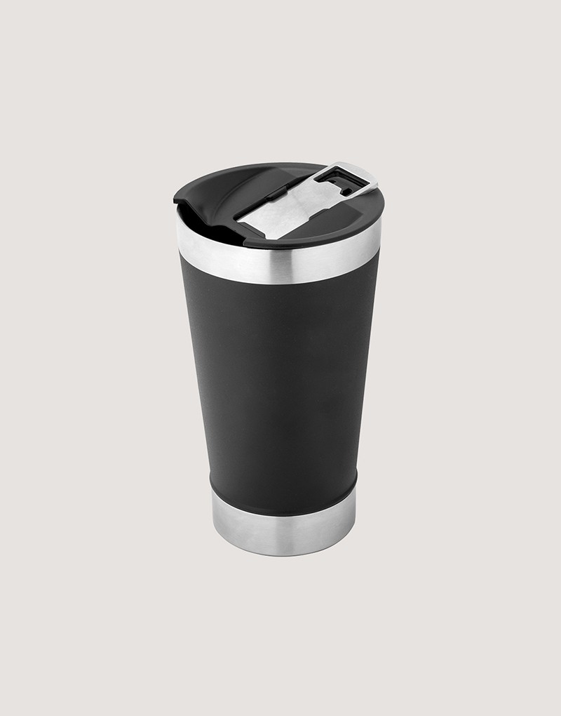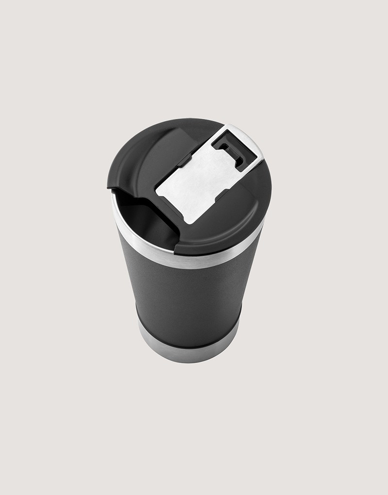 Copo de viagem em aço inox térmico, com parede dupla isolada a vácuo. Capacidade até 630 mL. A tampa inclui um abridor de garrafas. Ideal para preservar as suas bebidas frias ou quentes. Fornecido em caixa presente de papel kraft. Certificação EU Food Grade.