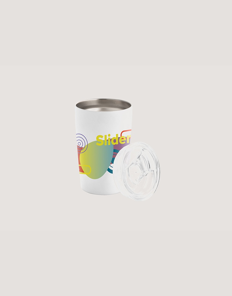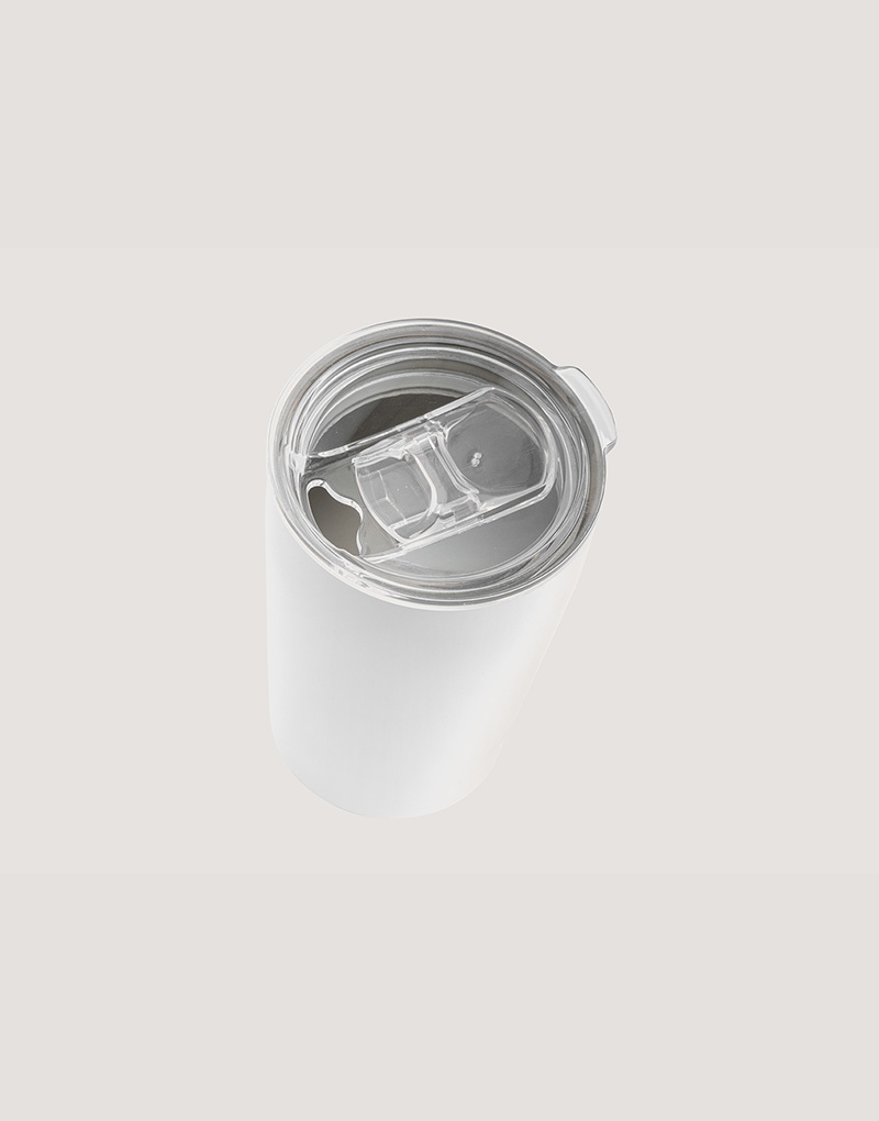 Copo de viagem para sublimação em aço inox de parede dupla térmica, isolada a vácuo. Incluso tampa transparente com abertura deslizante. Capacidade até 380ml. Preserva as bebidas quentes por 6h e frias por 12h. Fornecido em caixa presente. Certificação EU Food Grade.