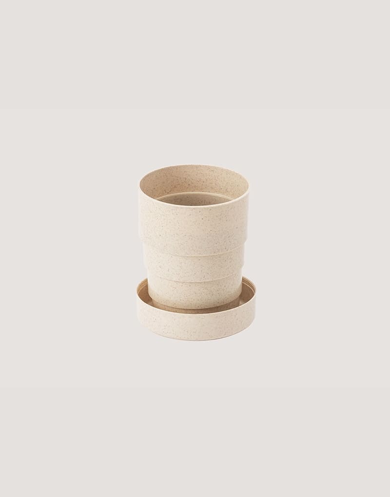 Copo de viagem retrátil em fibra de bambu (60%) e PP (40%) com capacidade até 210 mL. Incluso caixa para comprimidos e mosquetão. Certificação EU Food Grade.