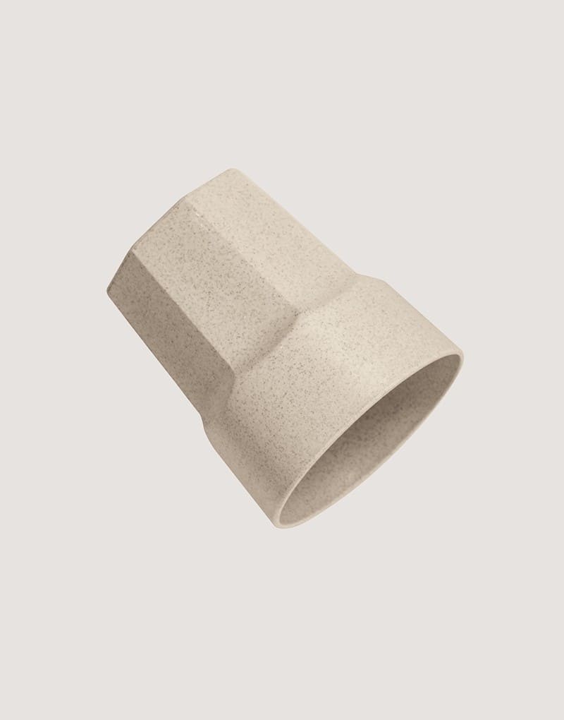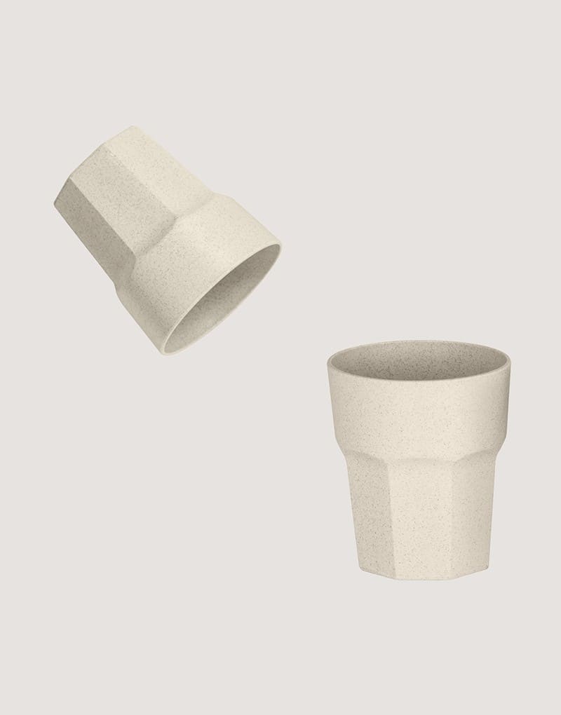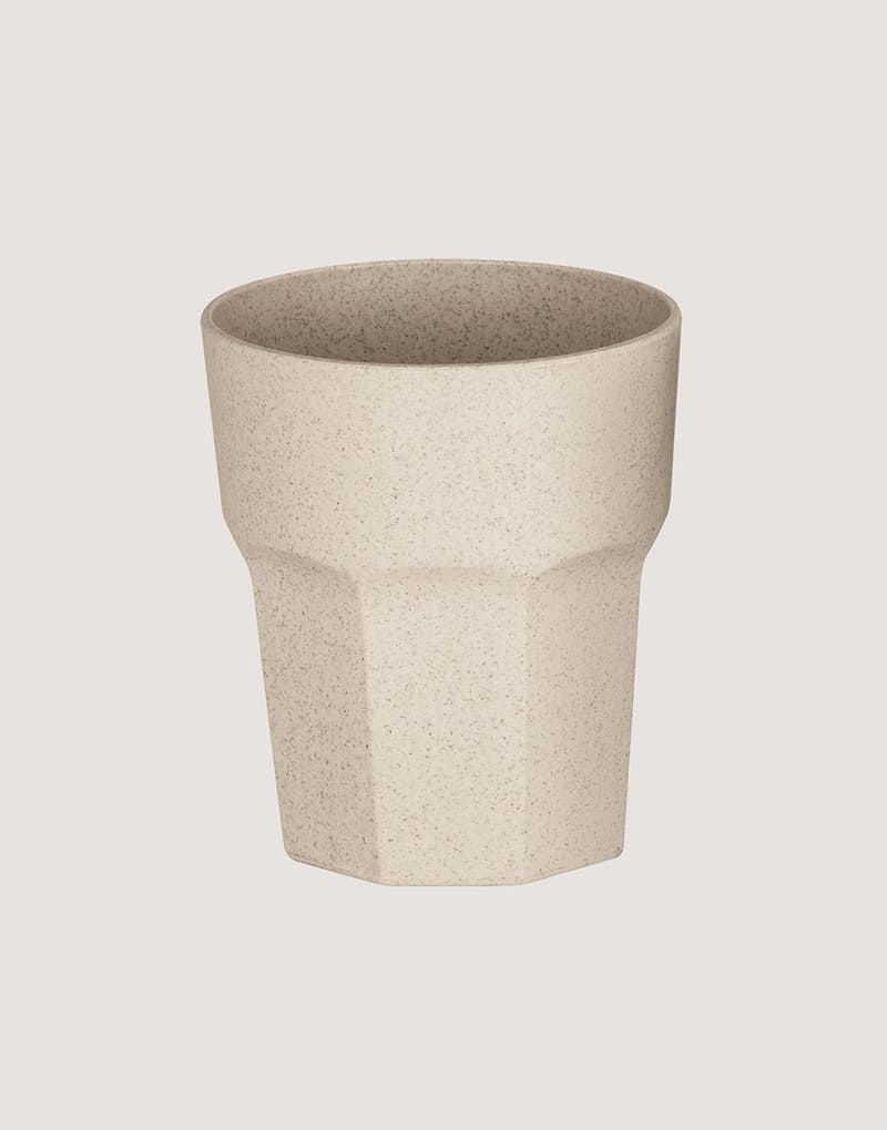 Copo em fibra de arroz (60%) e PP (40%) com acabamento mate. Capacidade até 400 mL. Certificação EU Food Grade.