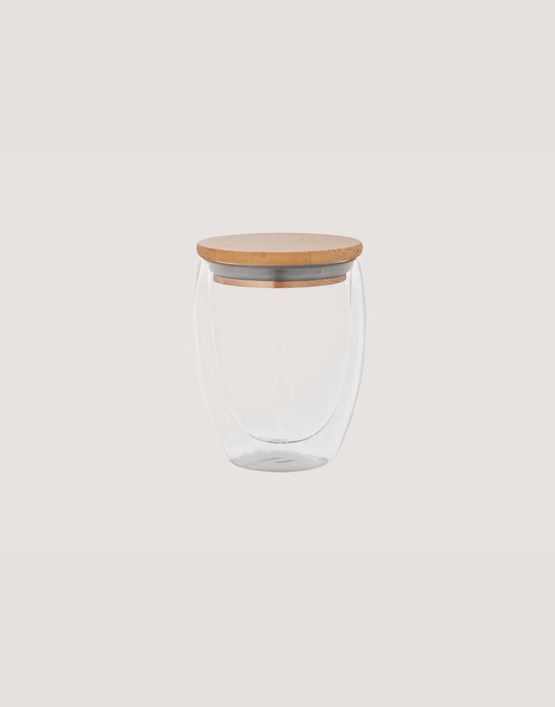 - Copo em Vidro Isotérmico de Paredes Duplas Isolada a Ar com Tampa em Bambu